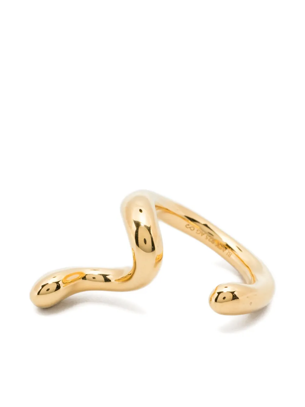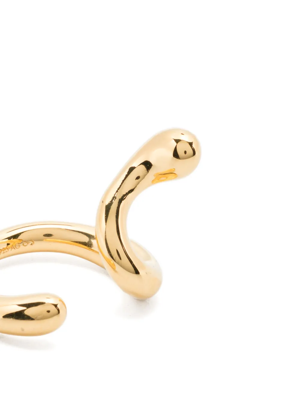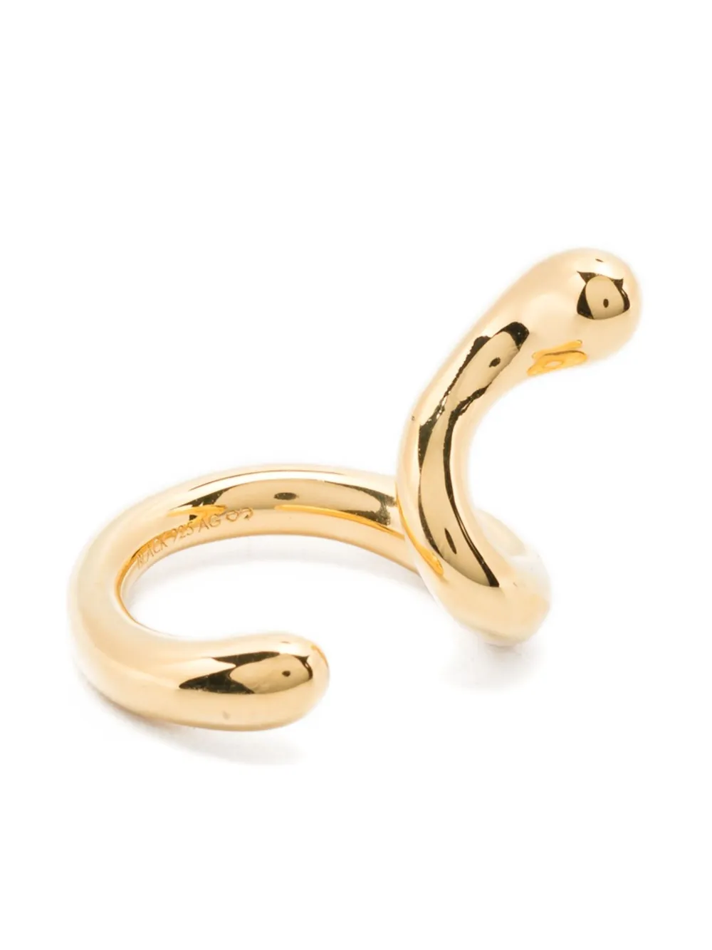 Серьга с позолоченным изогнутым дизайном и полированной отделкой. Обычное ежедневное использование и воздействие внешних факторов могут уменьшить блеск драгоценных камней и золотых поверхностей. Для ухода используйте специальные неабразивные средства, предназначенные для чистки украшений. Это одиночная серьга.