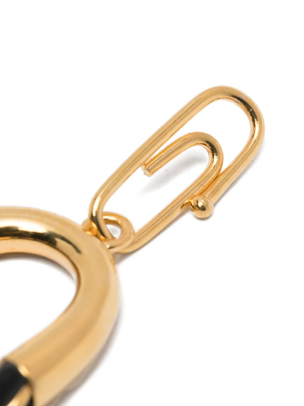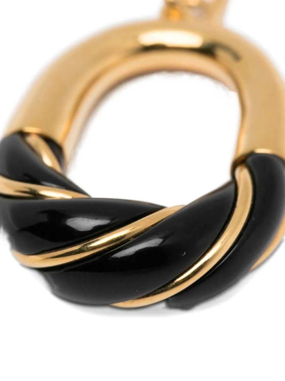 Овальный кулон с золотистым покрытием, черной эмалью, элементом в виде скрепки и изогнутым дизайном. При обычном ежедневном использовании и под воздействием внешних факторов блеск драгоценных камней и золотых поверхностей может снизиться. Для ухода используйте специальные неабразивные средства, предназначенные для чистки ювелирных изделий.