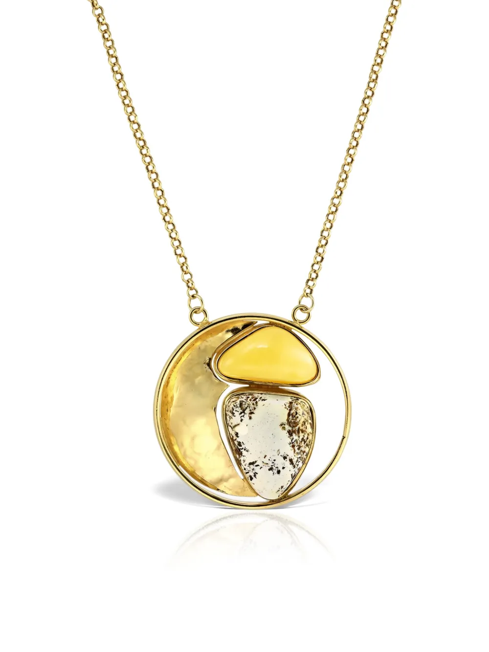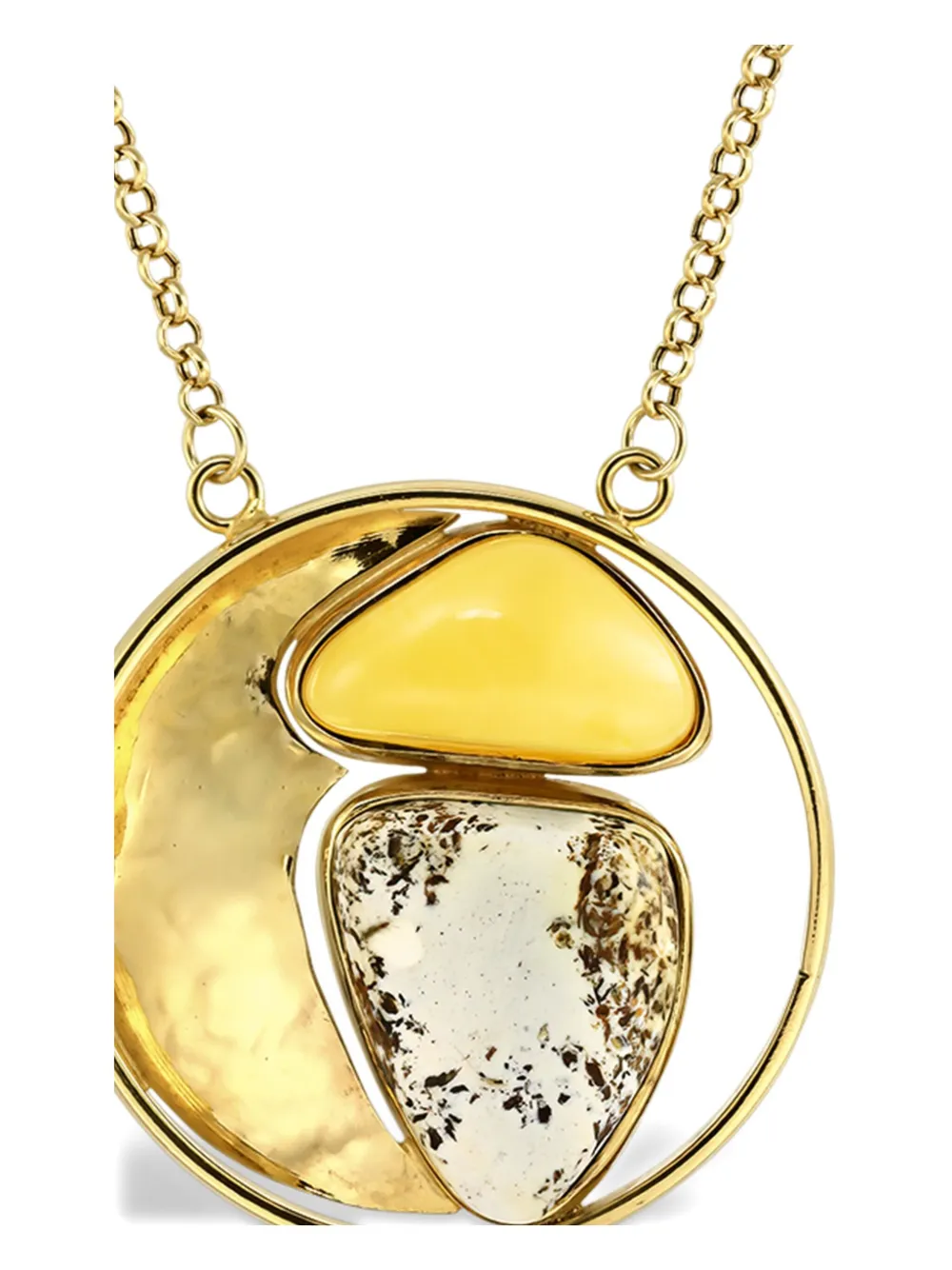 Кулон круглой формы с инкрустацией камня на цепочке золотистого цвета. При обычном ежедневном использовании и под воздействием внешних факторов блеск драгоценных камней и золотых поверхностей может уменьшаться. Для ухода используйте специальные неабразивные средства, предназначенные для чистки ювелирных изделий.