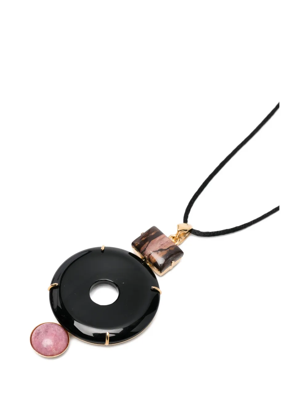 Черный, фурнитура золотистого оттенка, подвеска, регулируемая завязка. Обычное ежедневное использование и воздействие внешних факторов могут снизить блеск драгоценных камней и золота. Для ухода используйте специальные неабразивные средства, предназначенные для чистки ювелирных изделий. Этот аксессуар поставляется с защитным мешочком для хранения.
