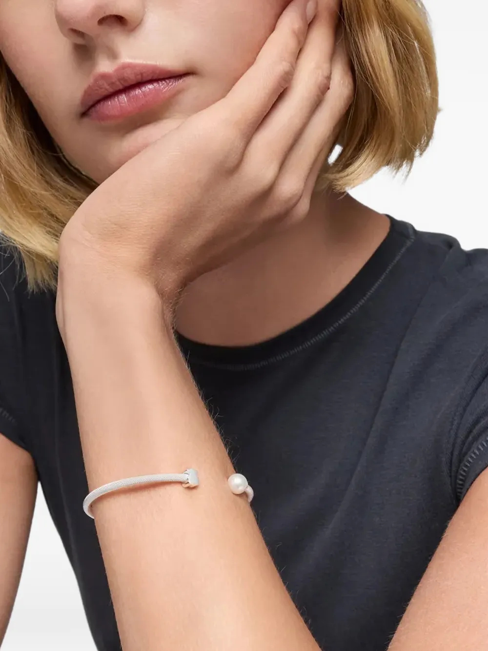 Серебряная открытая манжета с медвежьим мотивом, украшенная жемчужной деталью, полированная, надевается без застежек
