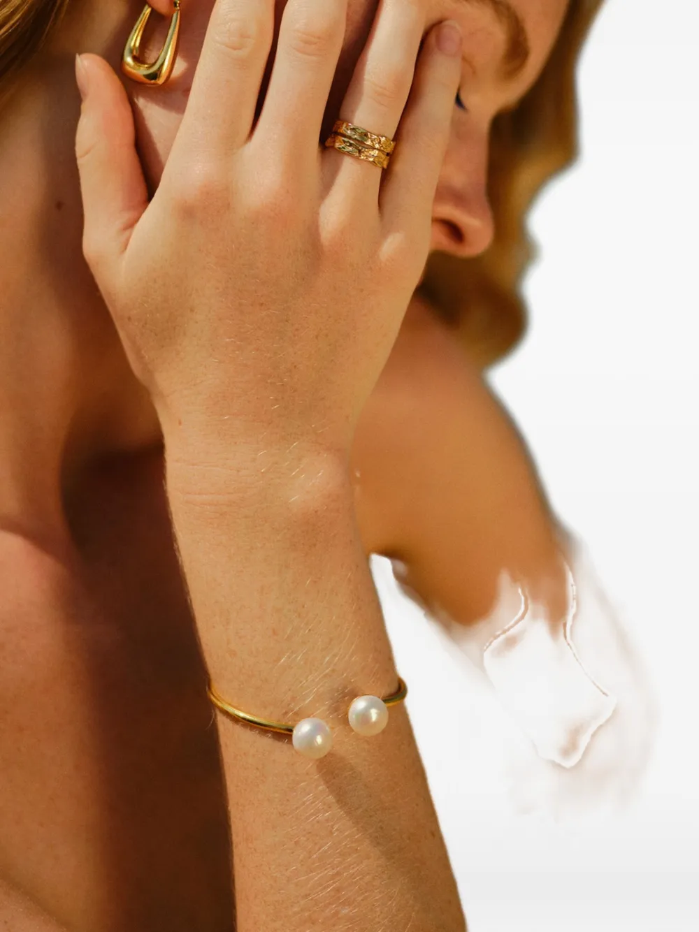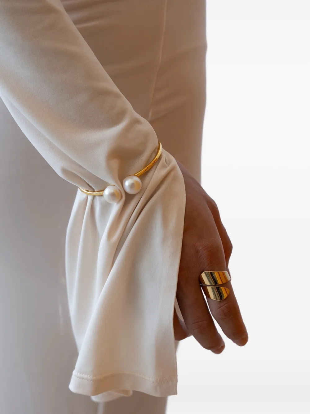 Позолоченное покрытие, серебро 925 пробы, украшение из жемчуга, открытый браслет-манжета. Обычное ежедневное использование и внешние воздействия могут уменьшить блеск драгоценных камней и золотых поверхностей. Для ухода используйте специальные неабразивные средства, предназначенные для чистки ювелирных изделий.