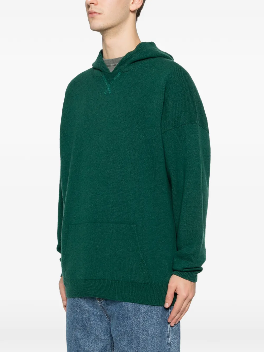 Зеленый цвет, передний карман-кенгуру, тональная строчка, длинные рукава, ребристый нижний край
