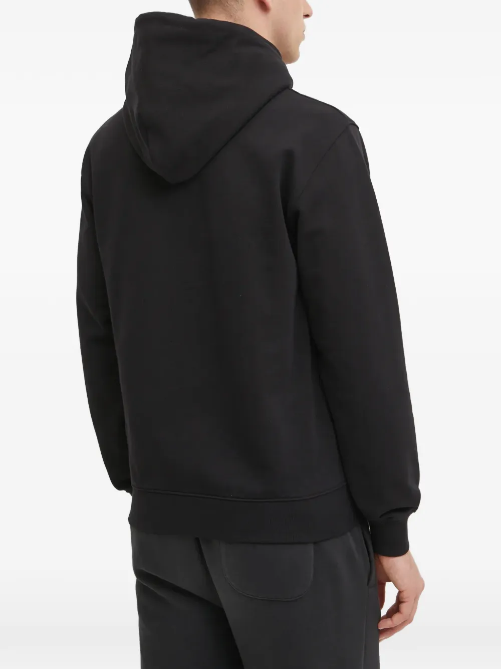 Черное худи с логотипом, шнурком, передним карманом-кенгуру, длинными рукавами и ребристым подолом