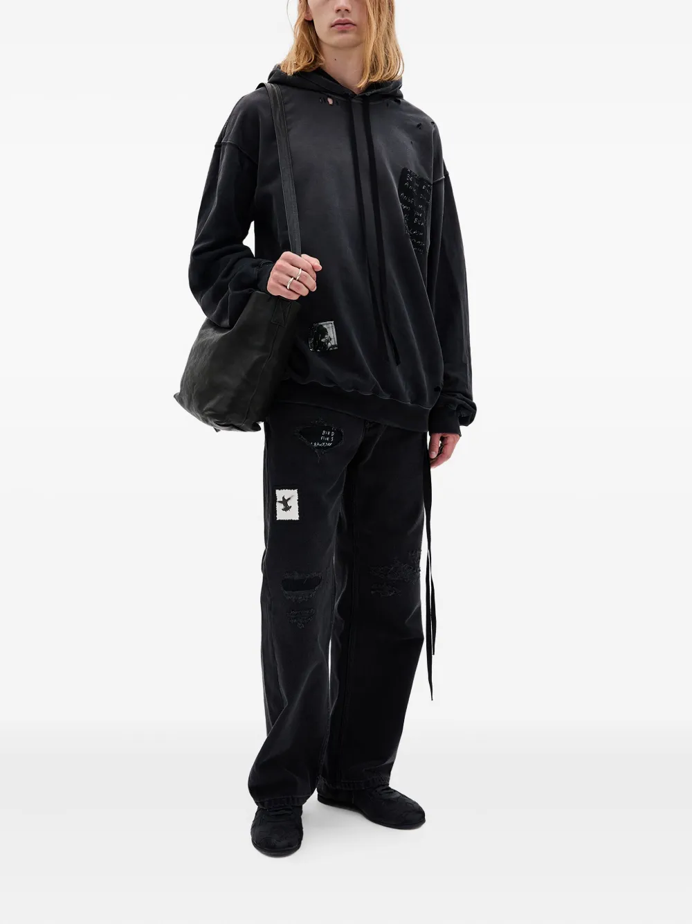 Черныйхлопковая тканьпотертостипринтованные нашивкикапюшон на кулиске