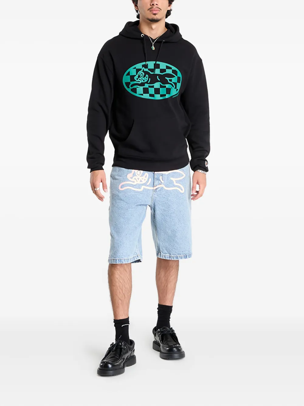 Черное худи с изображением бегущей собаки в клетку, графическим принтом, карманом-кенгуру, длинными рукавами и манжетами в резинку