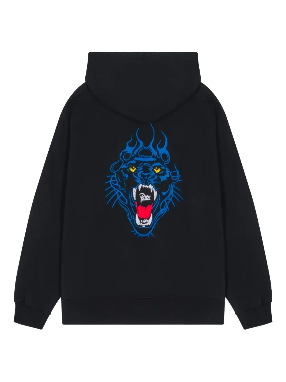 Черный цвет, капюшон на шнурке, передний карман-«кенгуру», ребристый край, ребристые манжеты, вышитый дизайн на спине
