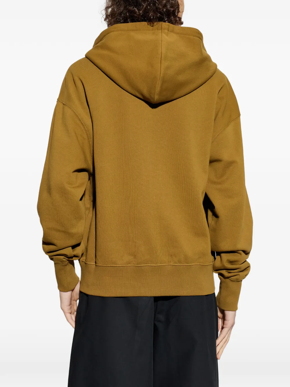 Горчичного цвета худи с капюшоном, застежкой-молнией спереди, логотипом, карманом-кенгуру и ребристым нижним краем