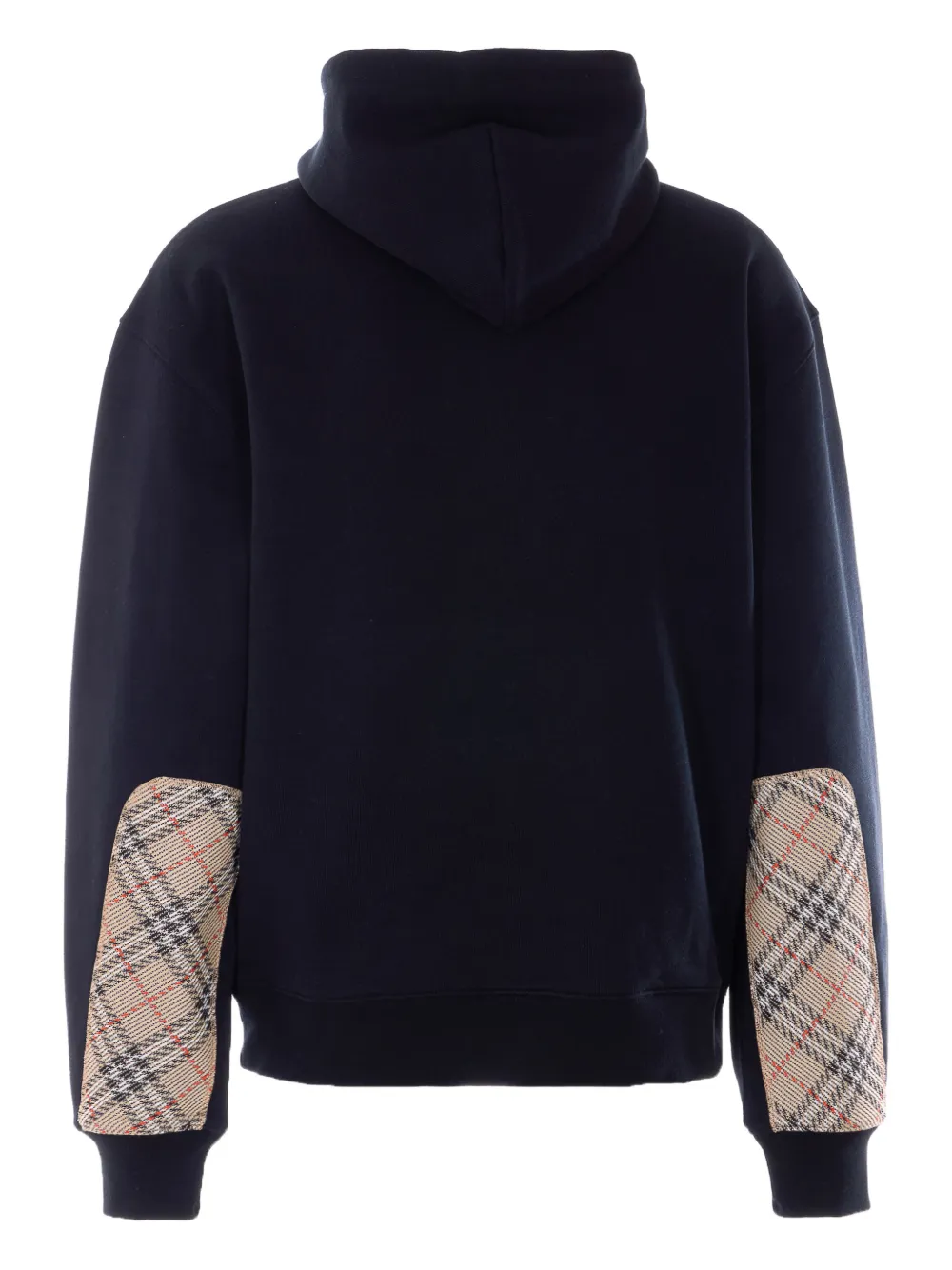 Синий цвет, вышитый логотип, клетчатые нашивки, длинные рукава, капюшон на кулиске, карман-кенгуру