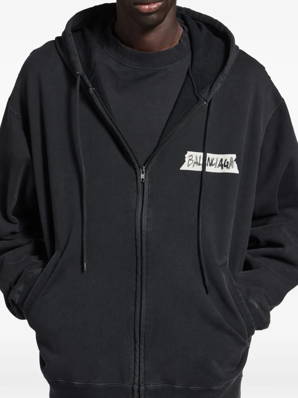 Черный капюшон, застежка-молния спереди, передние карманы, потертые детали