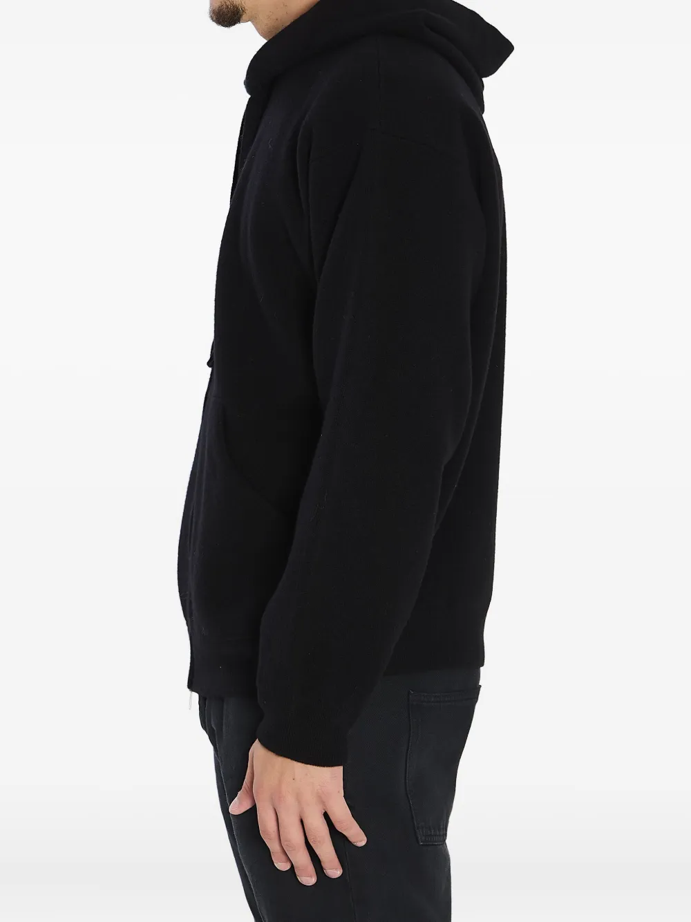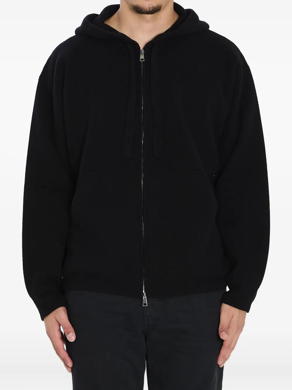 Черная толстовка с капюшоном из мериносовой шерсти, шнурок на капюшоне, застежка-молния спереди, карманы-кенгуру, ребристые манжеты и низ
