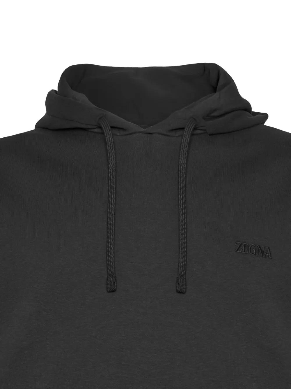 Черный худи с кулиской, вышитым логотипом, ребристым подолом и манжетами