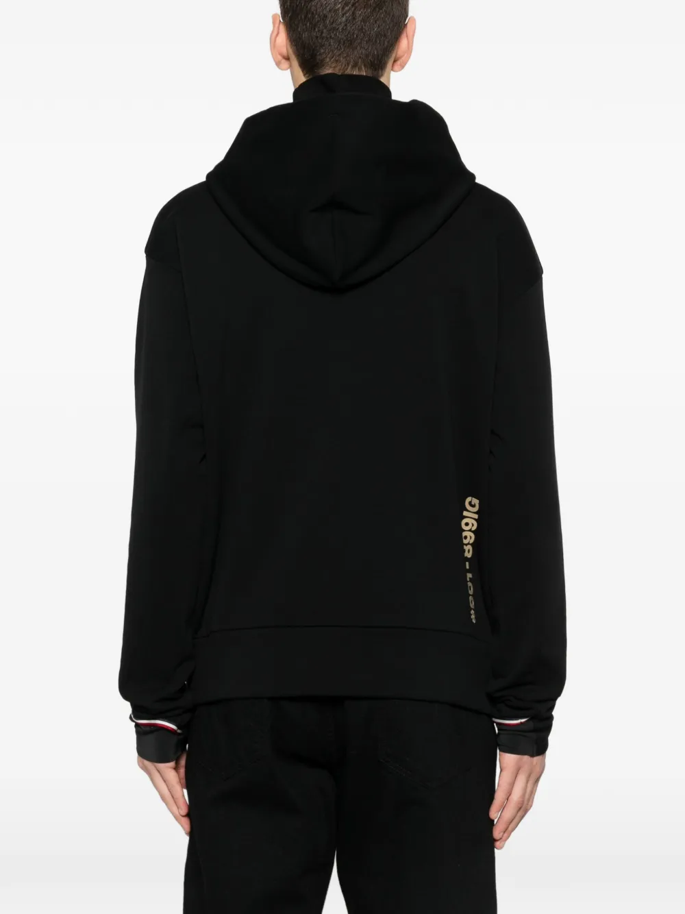 Черная худи с графическим принтом, кулиской, длинными рукавами, логотипом на рукаве и ребристым краем