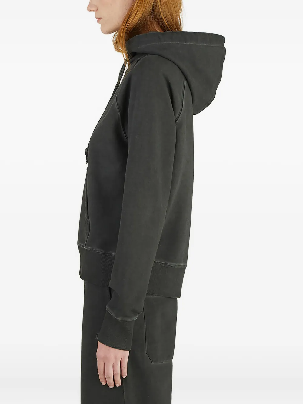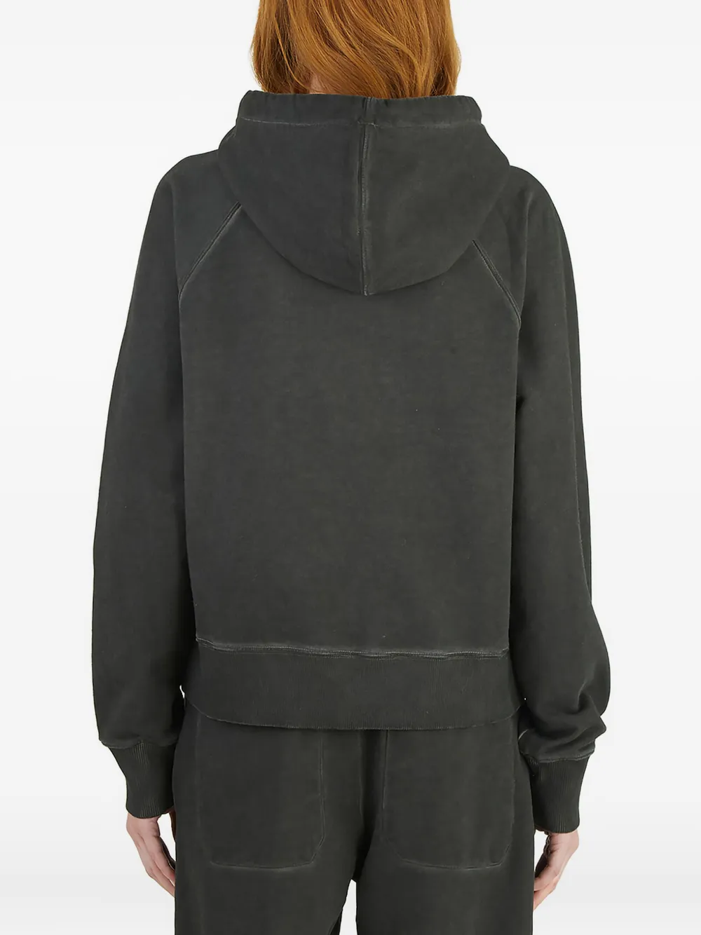 Темно-серое худи на шнурке, рукава-реглан, карман-«кенгуру», свободный крой, небольшой логотип
