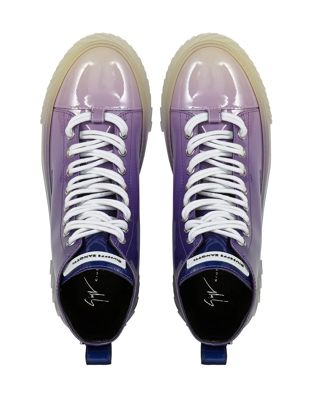 Лакированное покрытие, градиентный эффект, нашивка с логотипом на язычке, петля для подтягивания сзади, закругленный носок, шнуровка спереди, стелька с логотипом и плоская резиновая подошва. Цвет: фиолетовый.