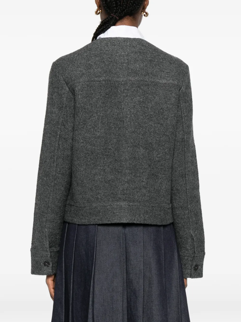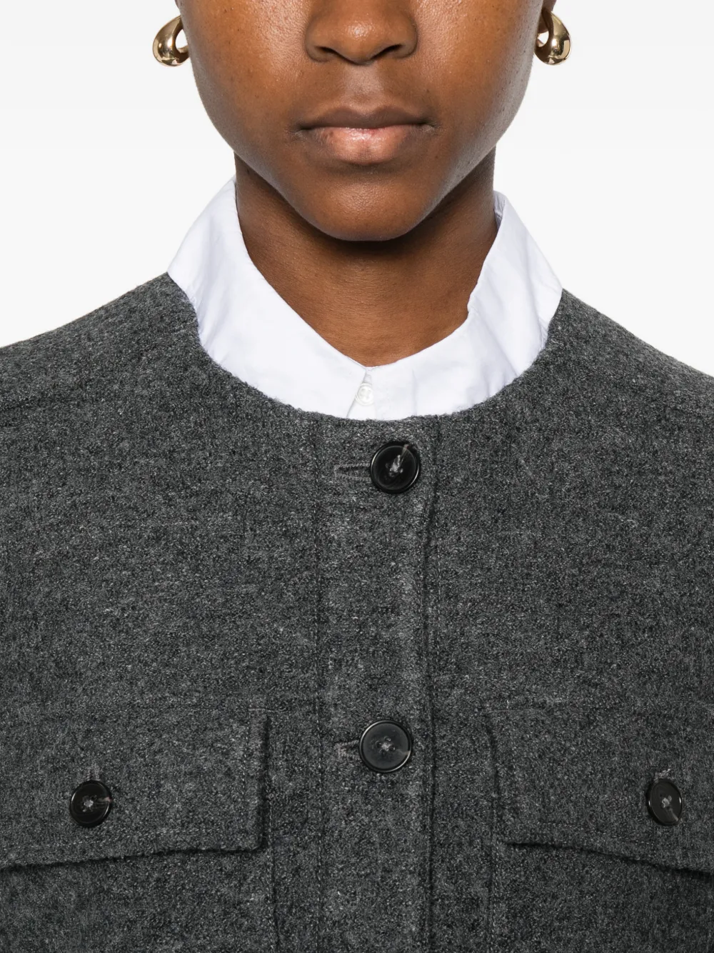 Серый, накладные карманы на груди, застежка на пуговицы, круглый вырез