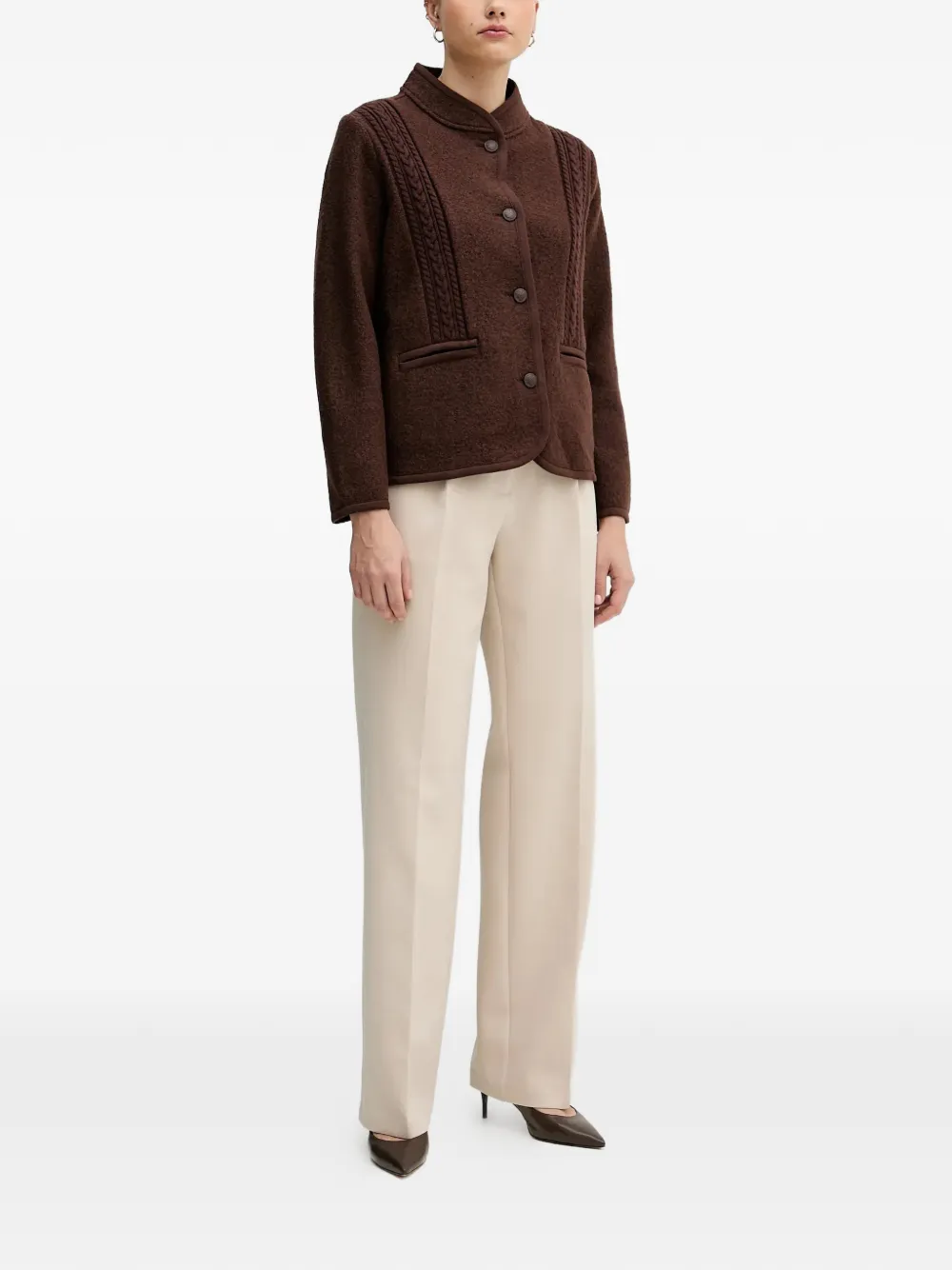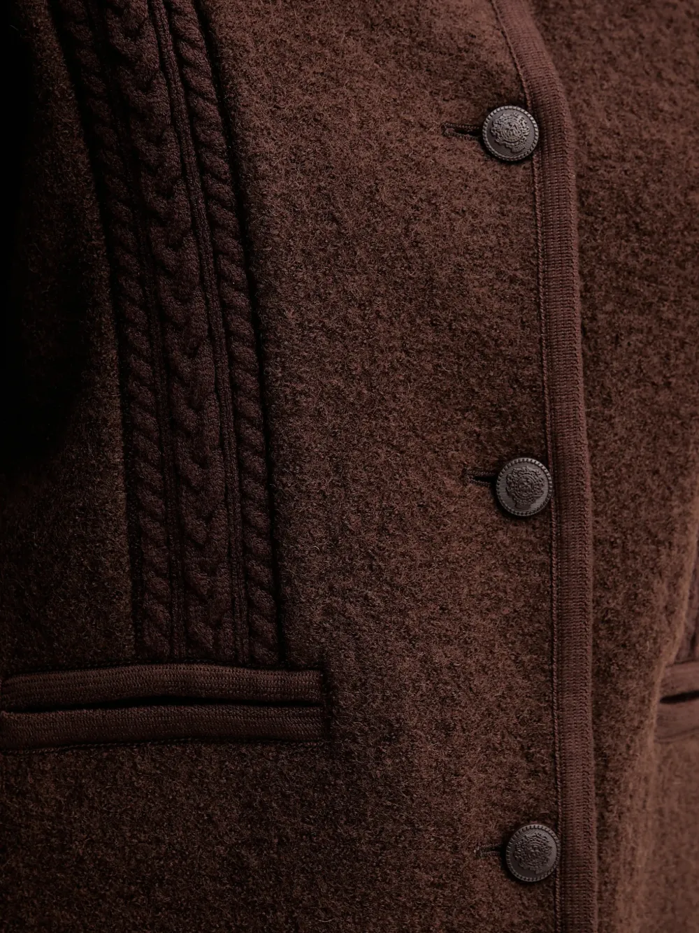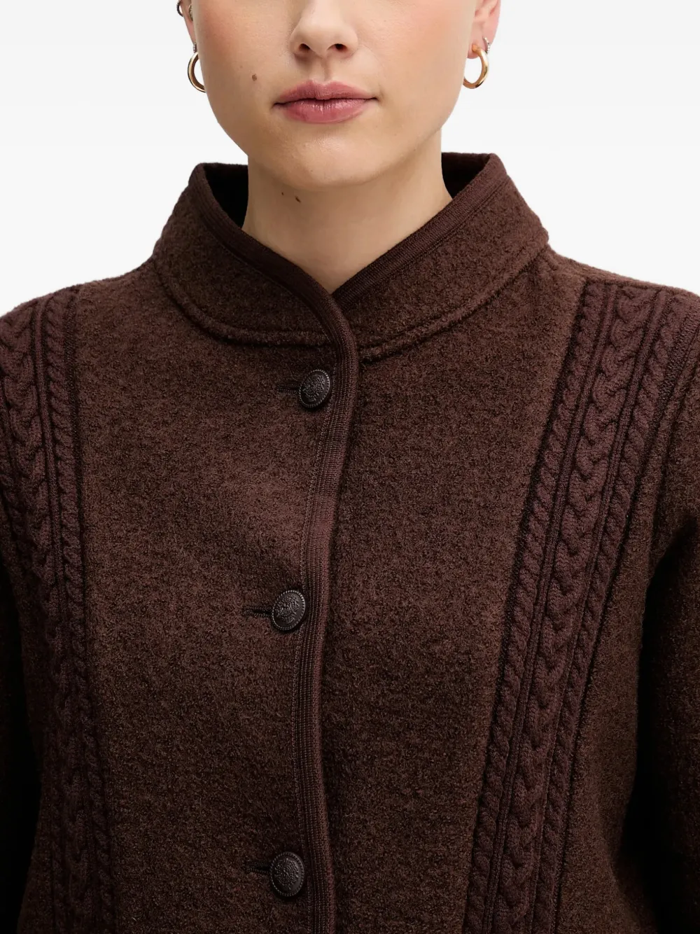 Коричневый цвет, кабельная вязка, застежка на пуговицы спереди, высокий воротник, отделка кантом, прорезные карманы