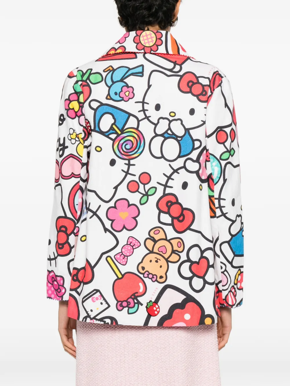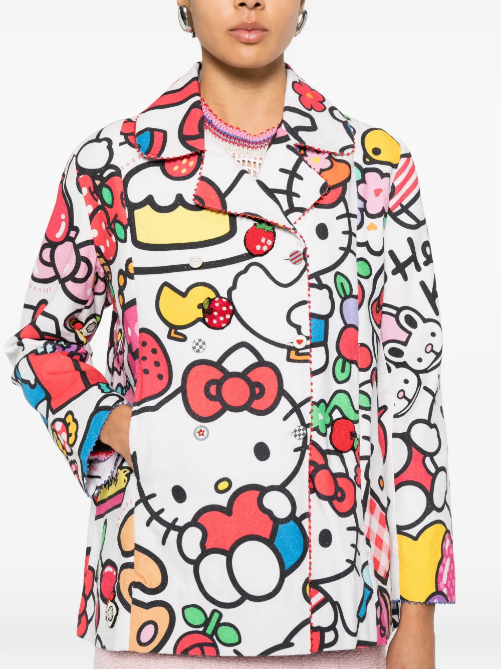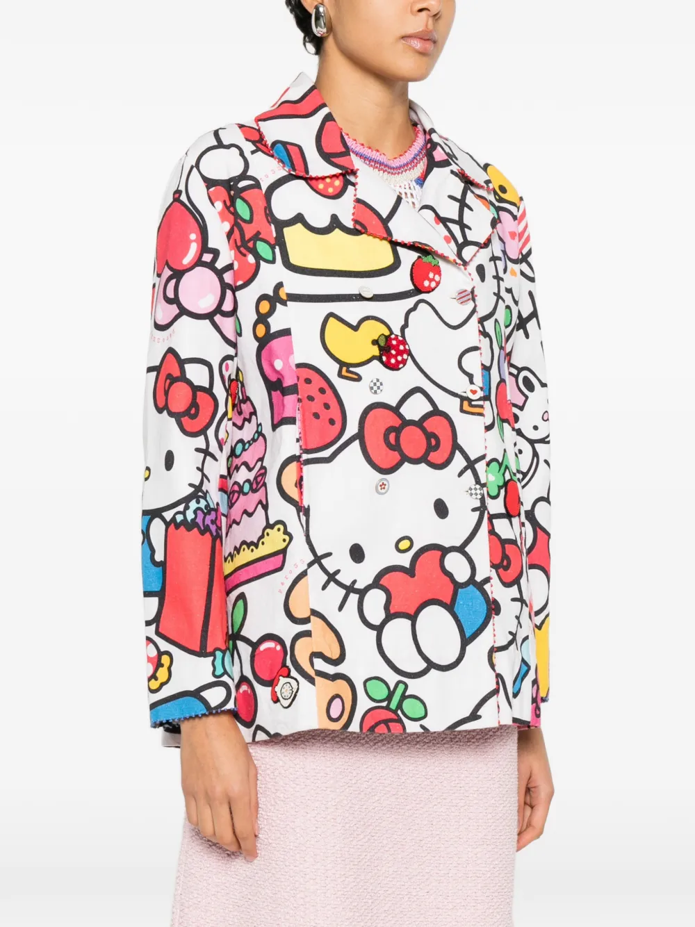 Белый и разноцветный, лацканы с вырезом, застежка на пуговицы, манжеты на пуговицах, контрастный узор