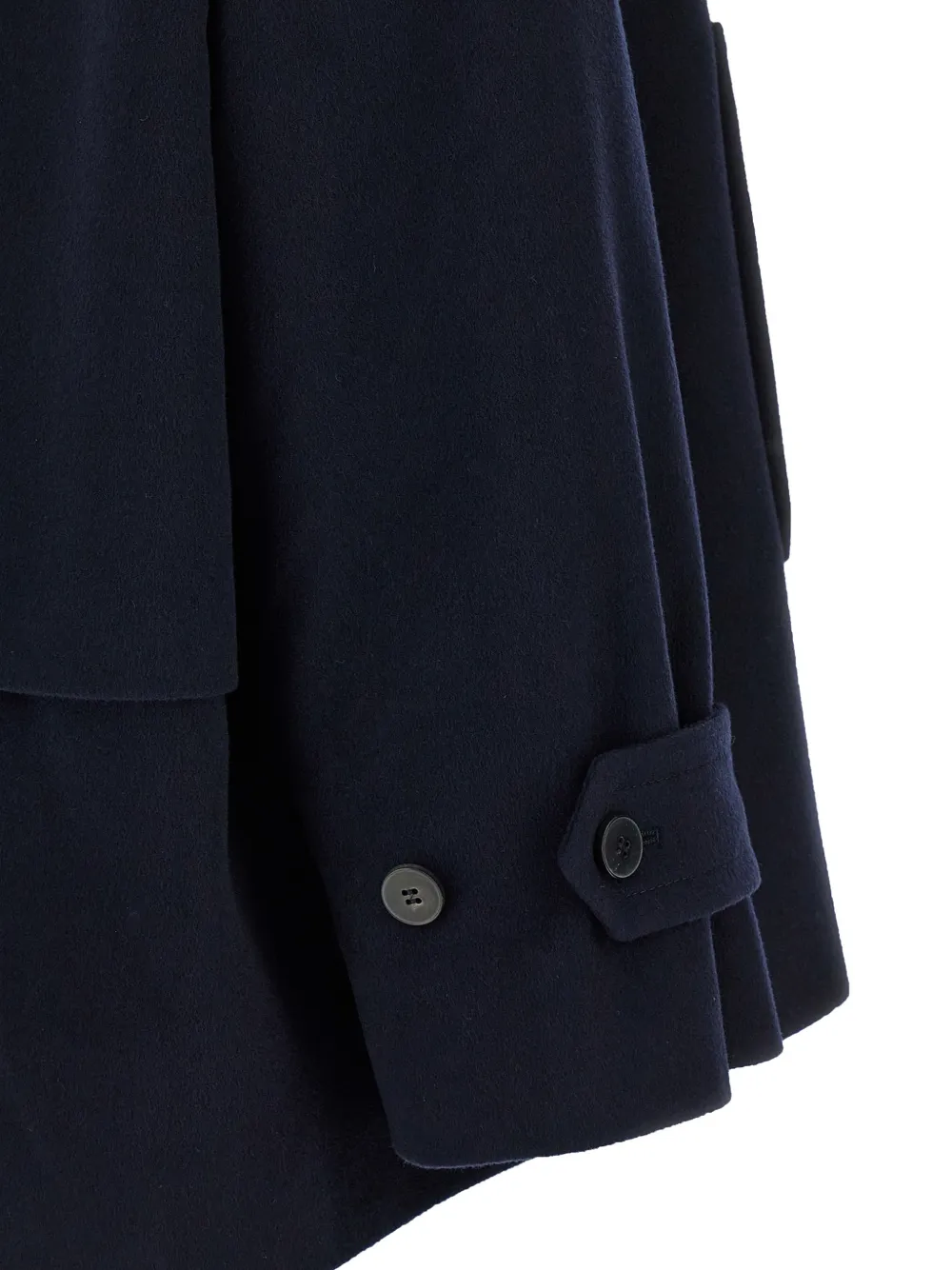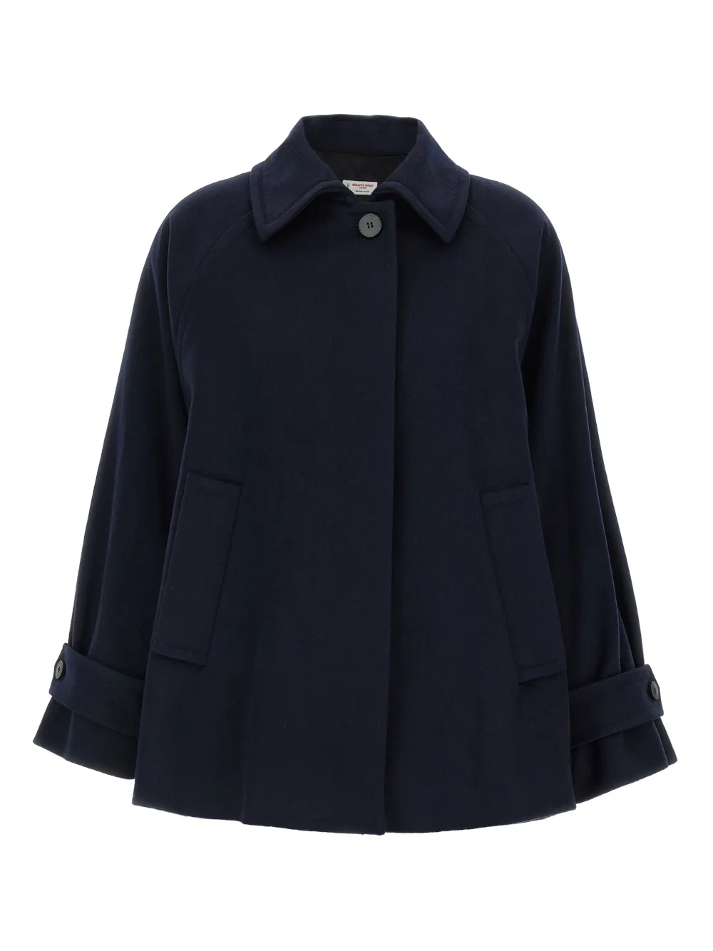 Синий цвет, воротник с острыми концами, скрытая застежка на пуговицы, рукава-реглан, боковые карманы