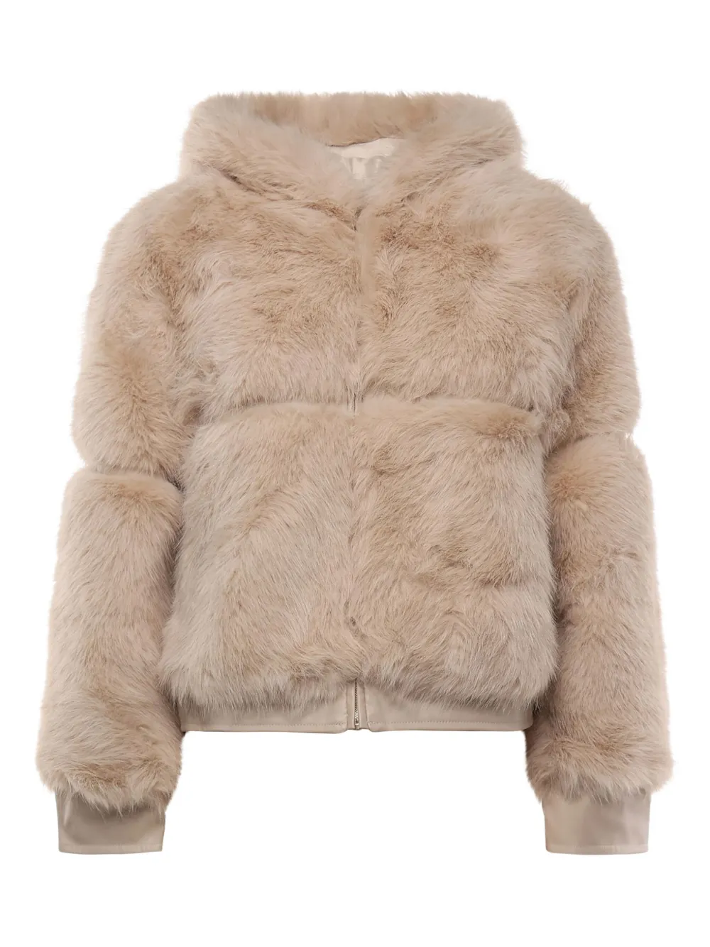 Светло-бежевый искусственный мех, капюшон, застежка-молния спереди