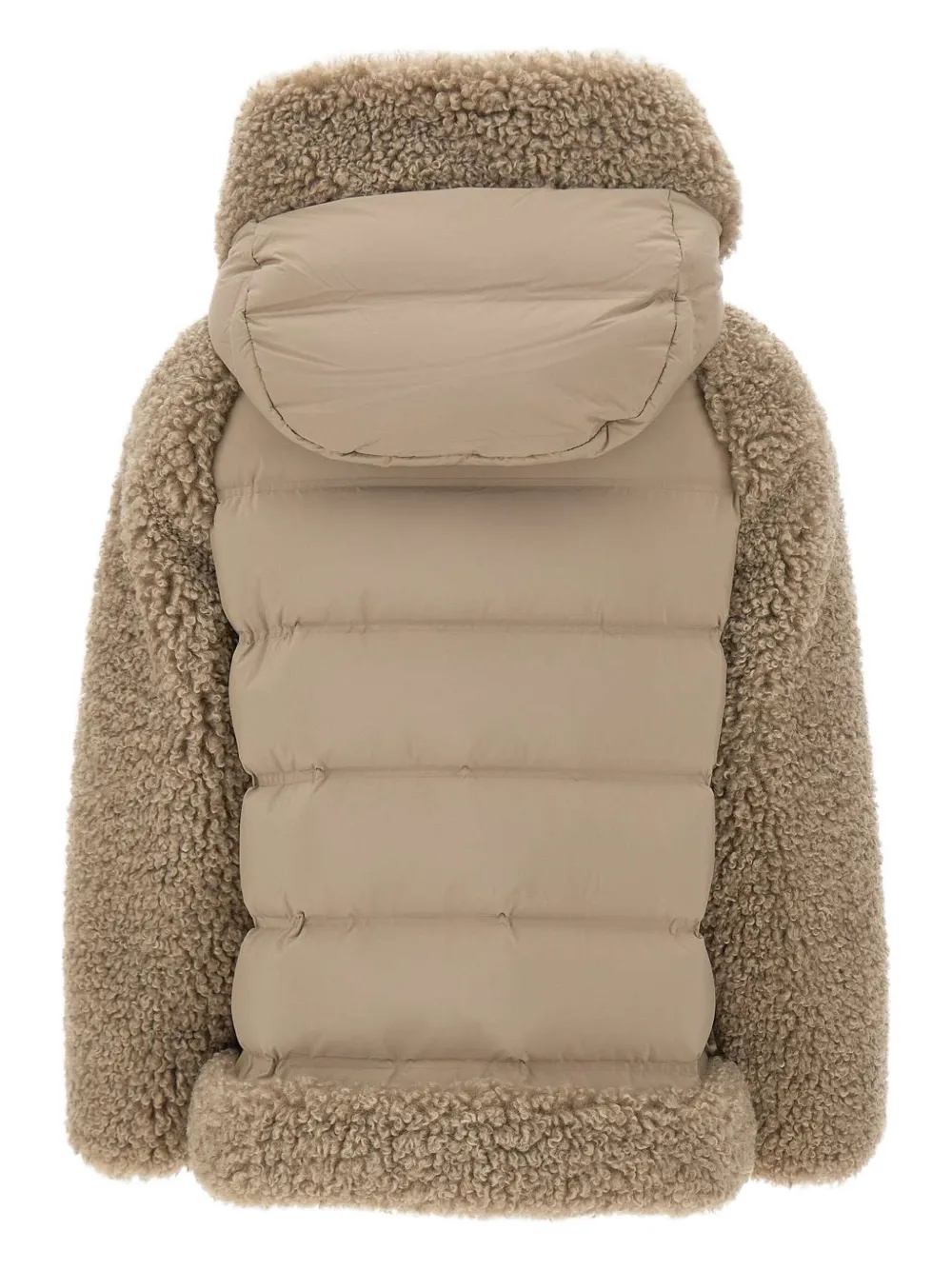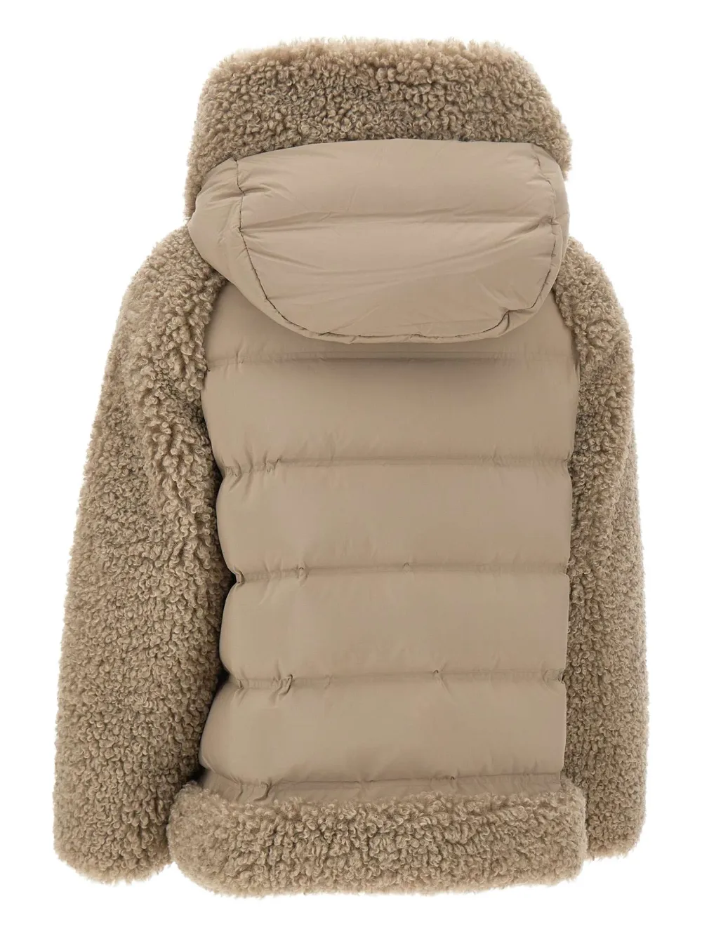 Бежевый утепленный дизайн, искусственный овечий мех, стеганые вставки, воротник-стойка, несъемный капюшон, скрытая застежка спереди, длинные рукава