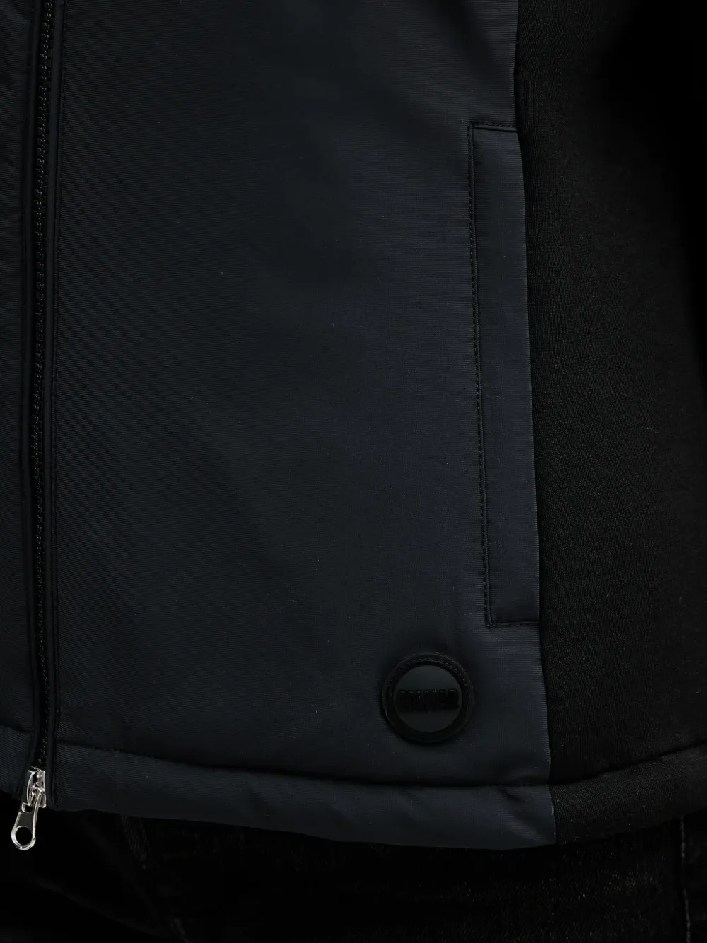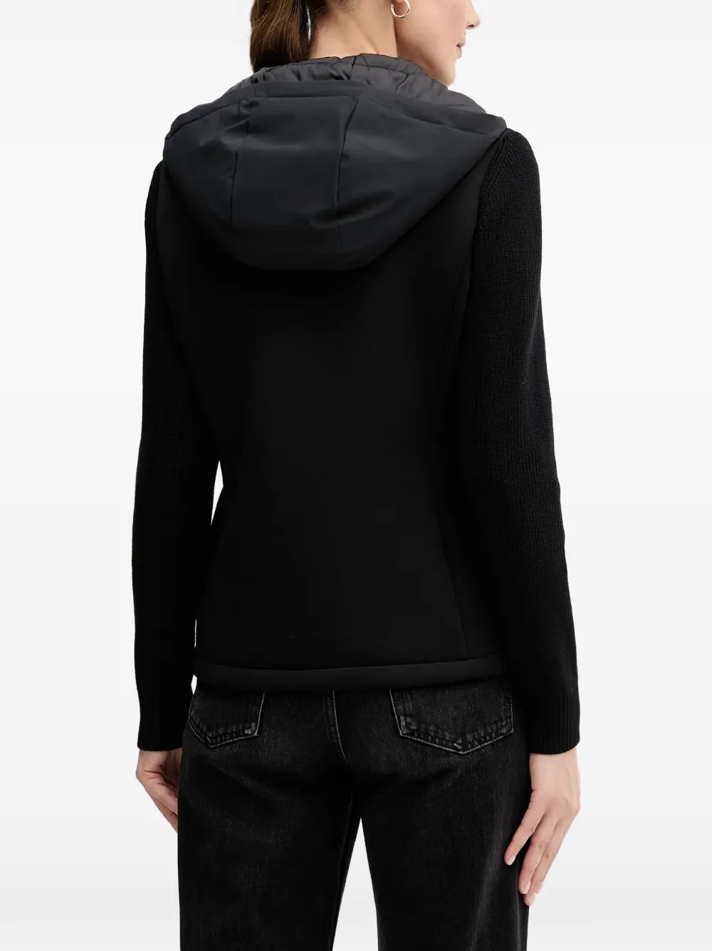 Черная куртка с панельным дизайном, застежкой-молнией, длинными рукавами, капюшоном и круглой нашивкой с логотипом