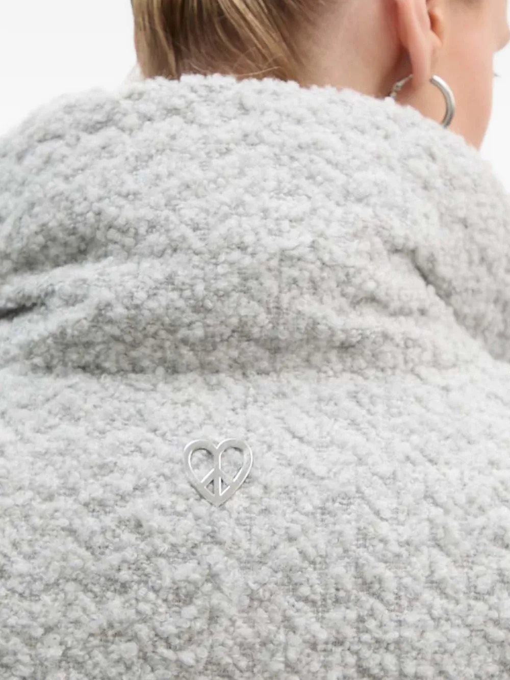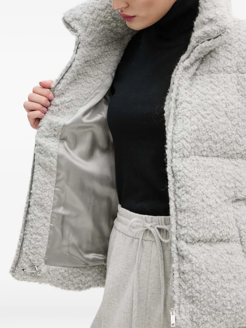 Светло-серый цвет, текстурированная отделка, застежка-молния, высокий воротник, передние карманы, логотип