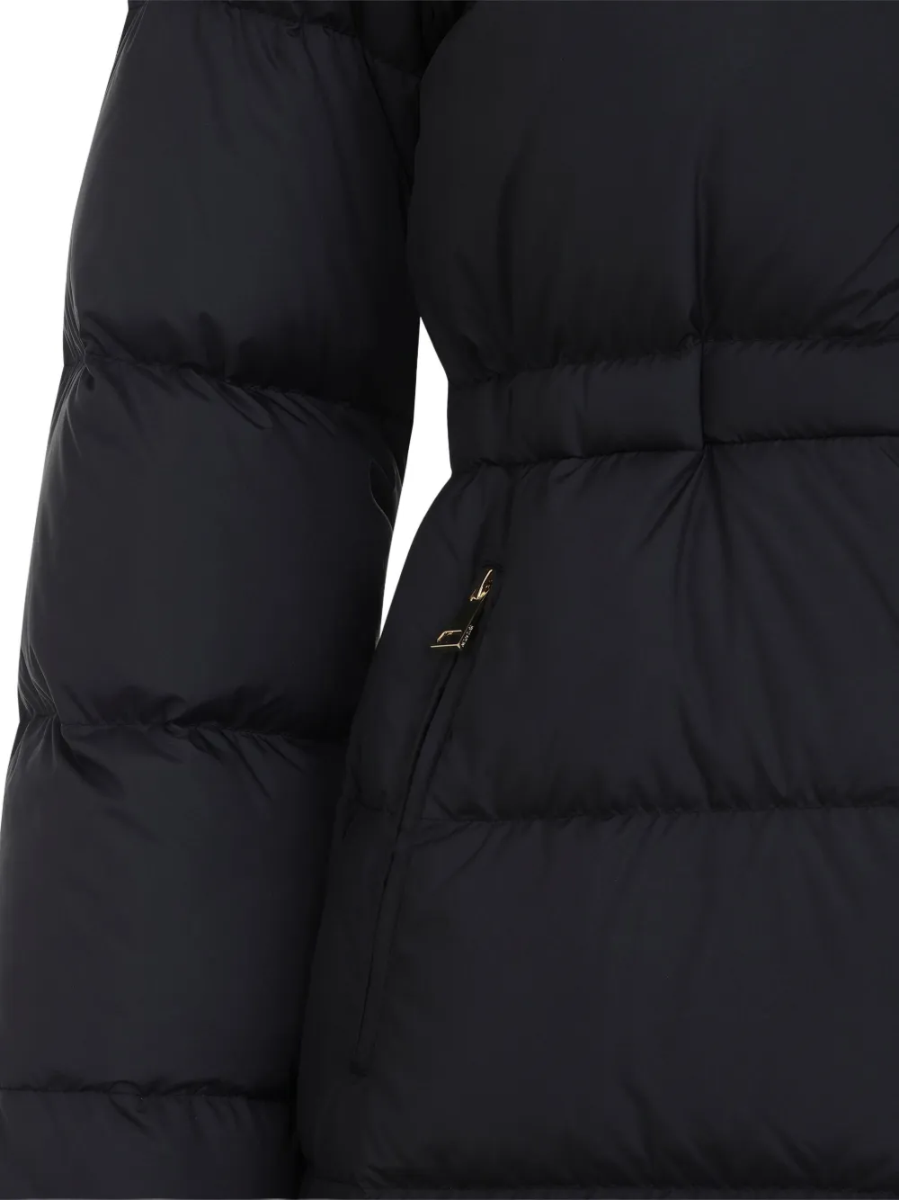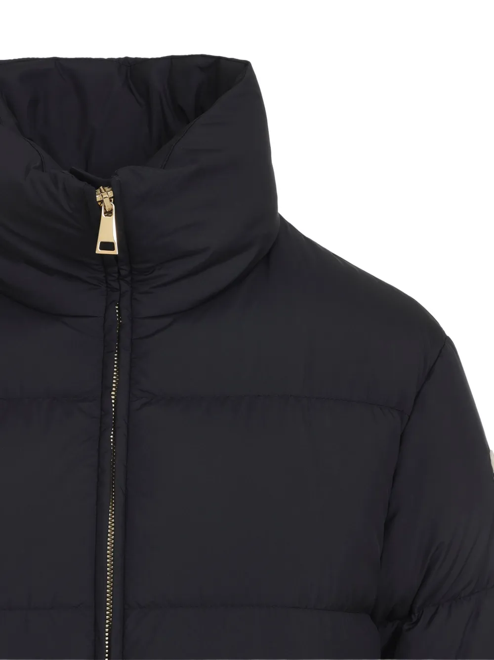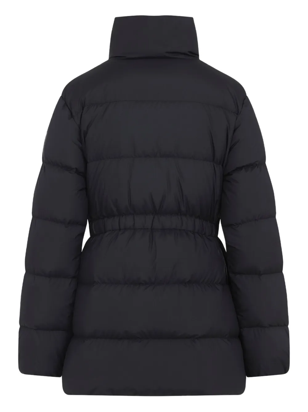 Черная пуховая куртка из переработанного полиэстера. Модель с высоким воротником, застежкой на молнию спереди, двумя передними карманами на молнии, эластичным поясом и манжетами, а также с нашивкой-логотипом на рукаве. Прямой крой. Рост модели - 177 см, на ней размер 01 US.Размерная сетка: US.Верх: 100% полиэстер; подкладка: 100% полиэстер; наполнитель: 90% пух гуся, 10% перо гуся.