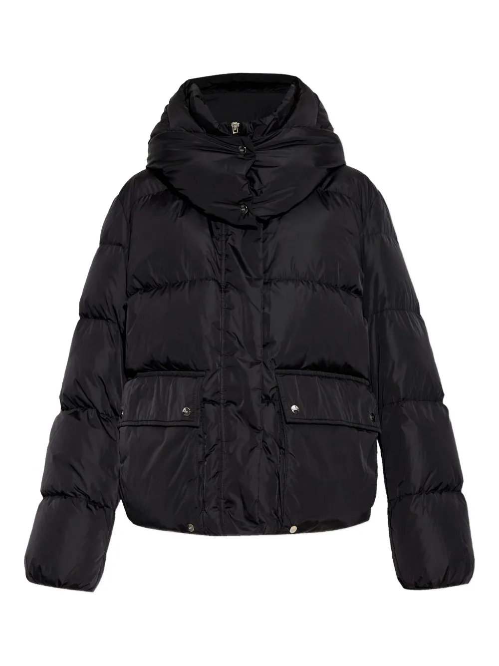 Черный цвет, стеганый дизайн, застежка на пуговицах спереди, передние карманы, капюшон