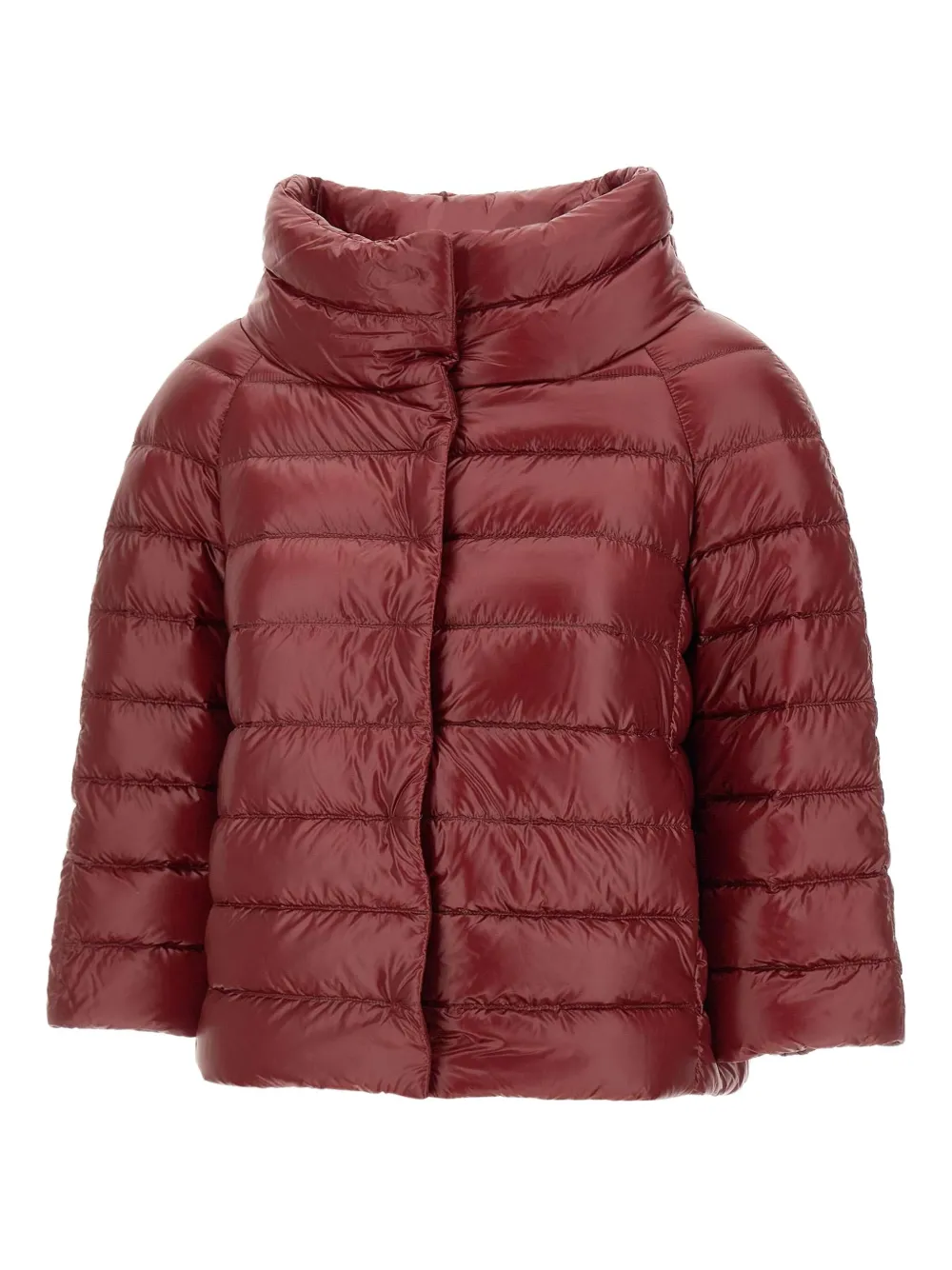 Красная стеганая куртка с воротником-стойкой, рукавами три четверти, застежкой на кнопки и прорезными карманами