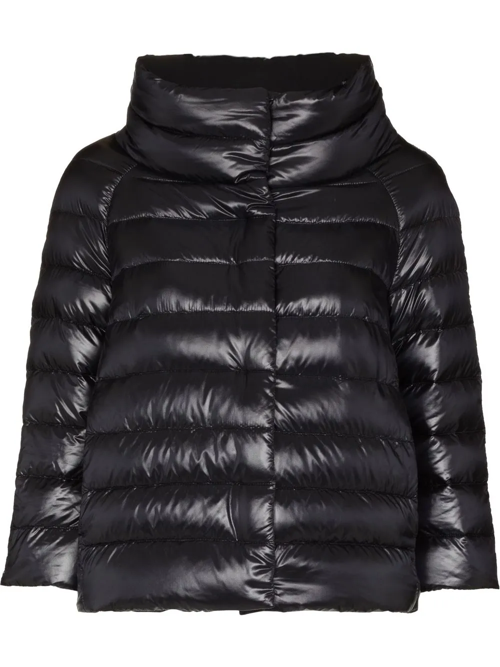 Черный, гусиный пух, смесовый хлопок, дутый материал, стеганая модель, лакированное покрытие, высокий воротник, застежка на молнии спереди, рукава три четверти и прямой подол.