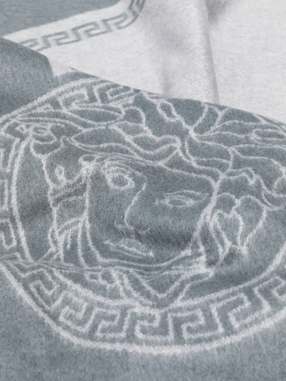 • Светло-серый, шиферно-серый, смесь кашемира и шелка, трикотажный материал, матовое покрытие, узор Medusa Head, знаковый орнамент Greca и края с бахромой.