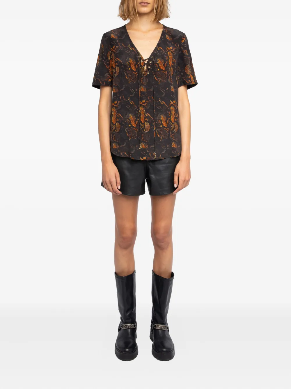 Черная и многоцветная блуза с принтом под питона, V-образным вырезом, шнуровкой и короткими рукавами