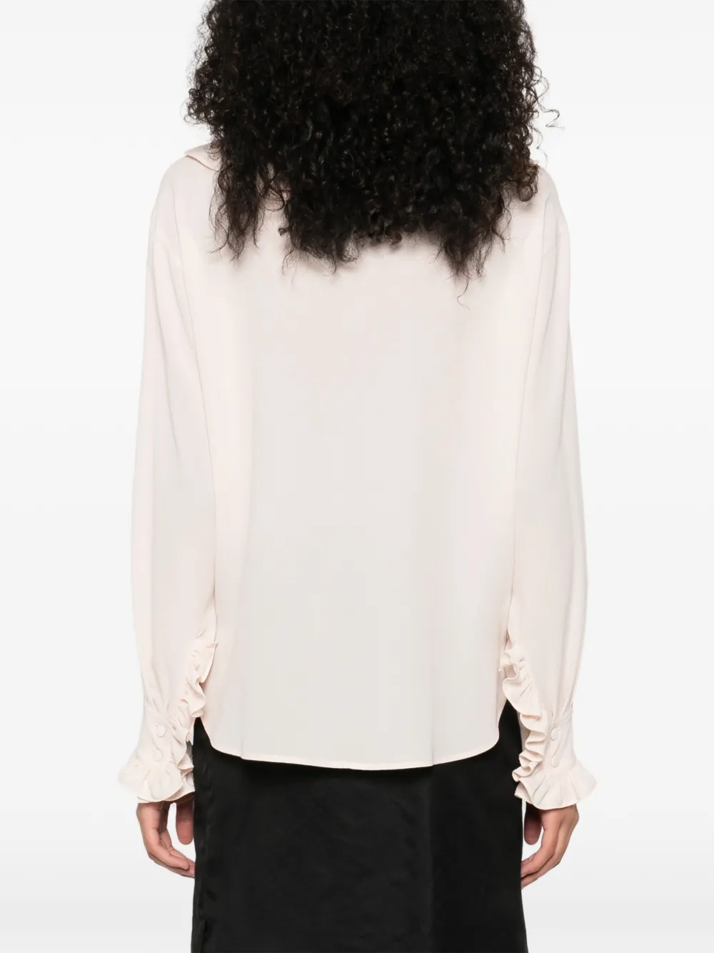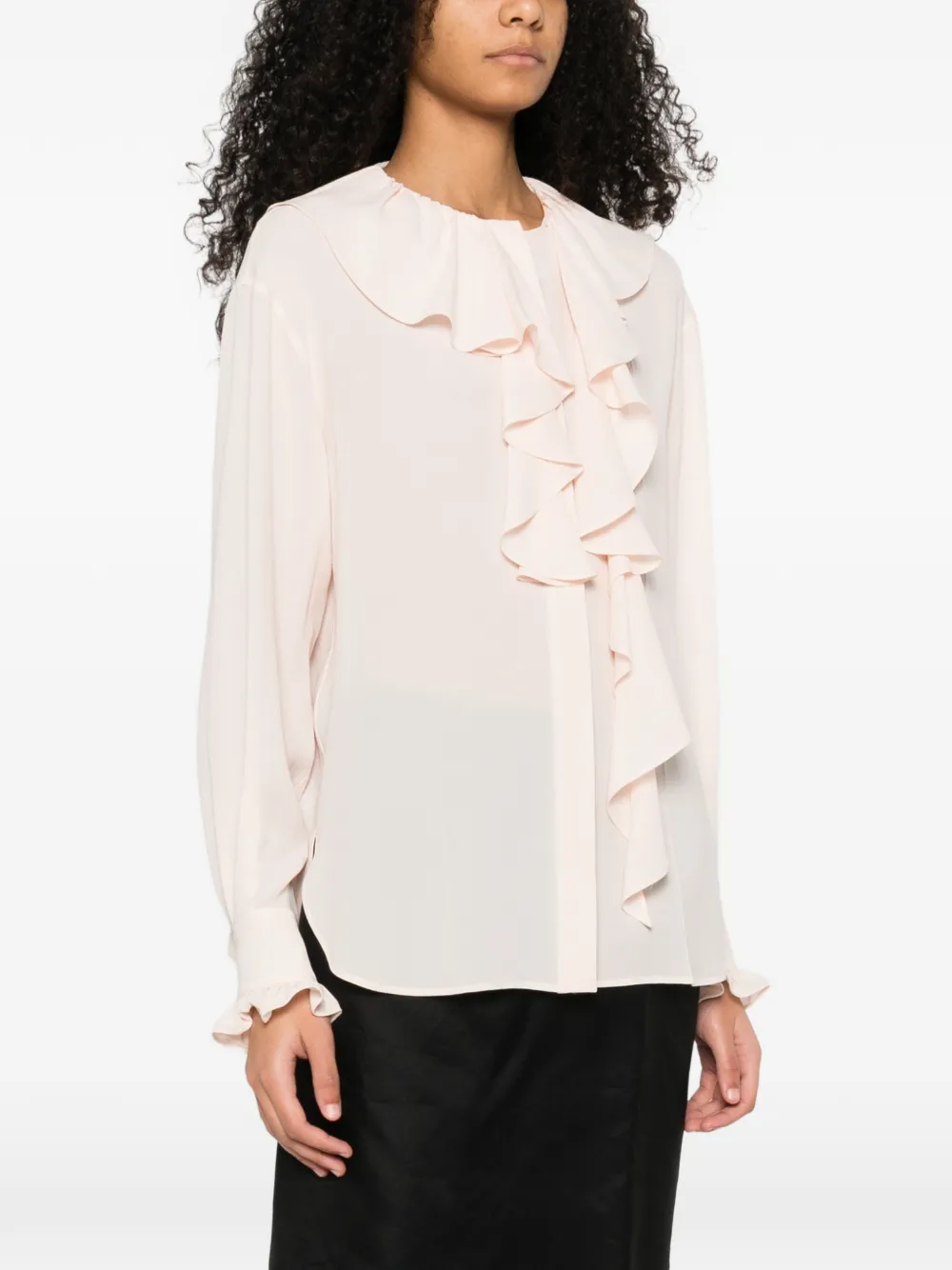 Розовые оборки, длинные рукава, застежка на пуговицы, рукава с оборками