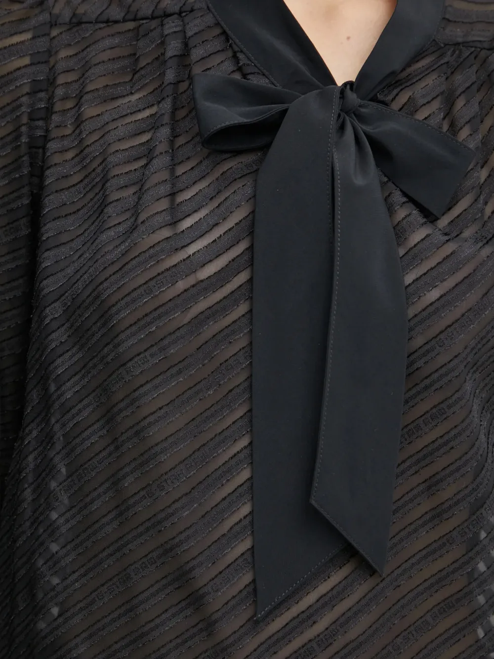 Черная полупрозрачная блузка с диагональным полосатым узором, завязками, длинными рукавами и манжетами на пуговицах