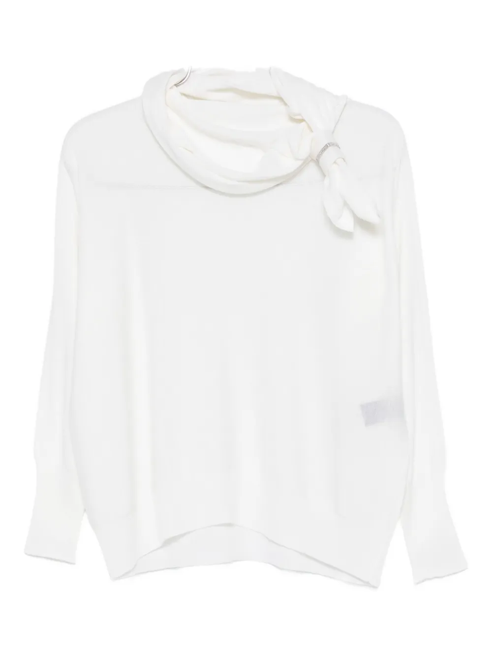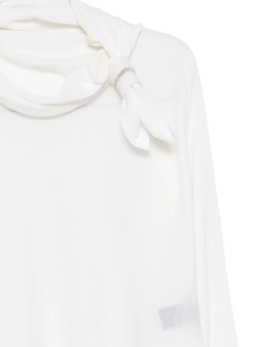 Белый топ с длинными рукавами, высоким воротом и завязками