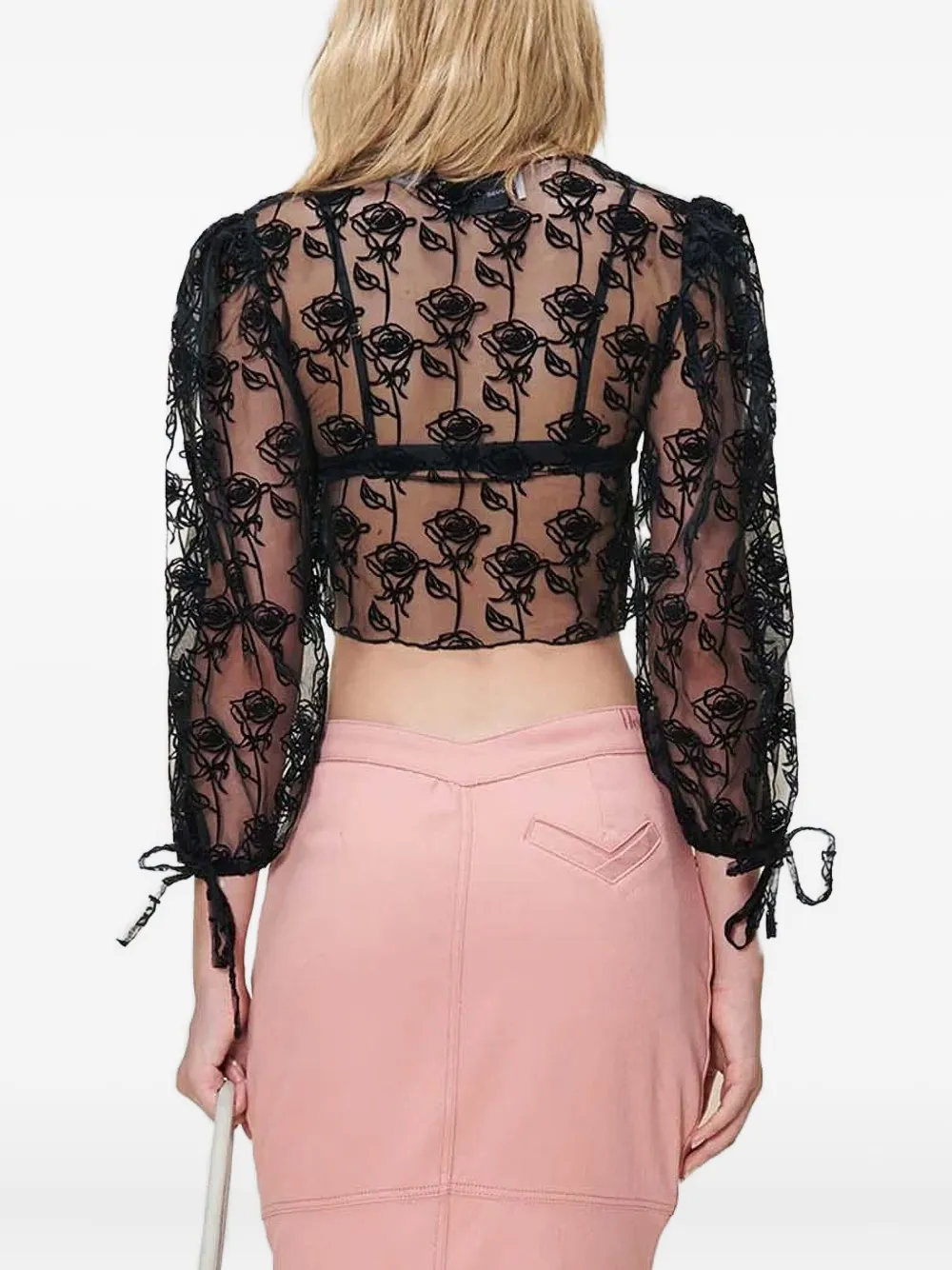 Черный с розовым узором V-образный вырез собранные плечи укороченный