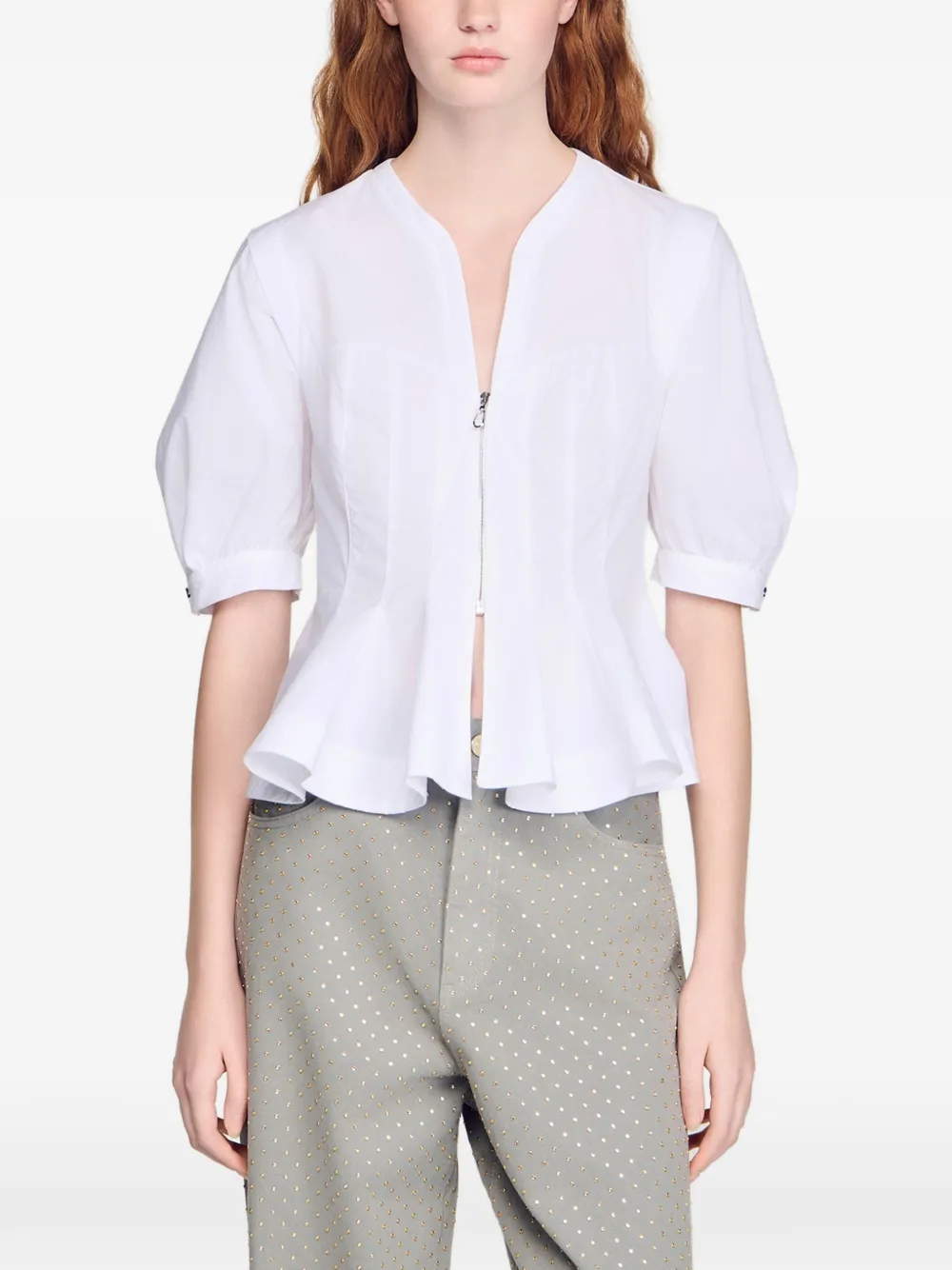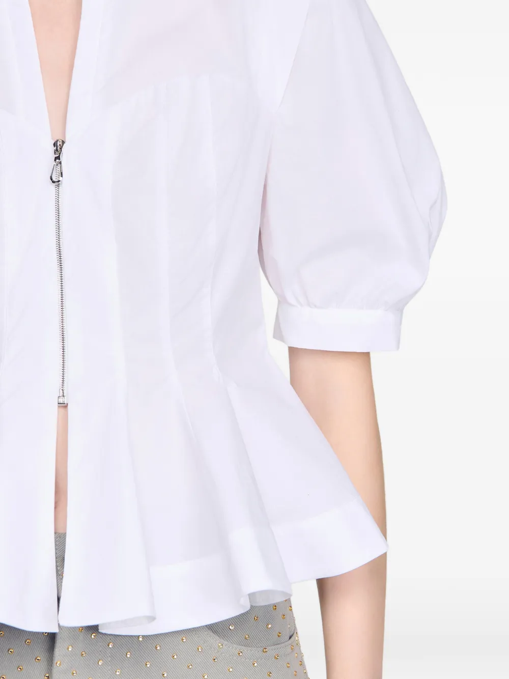 Белый топ с V-образным вырезом, застежкой-молнией, короткими рукавами и баской