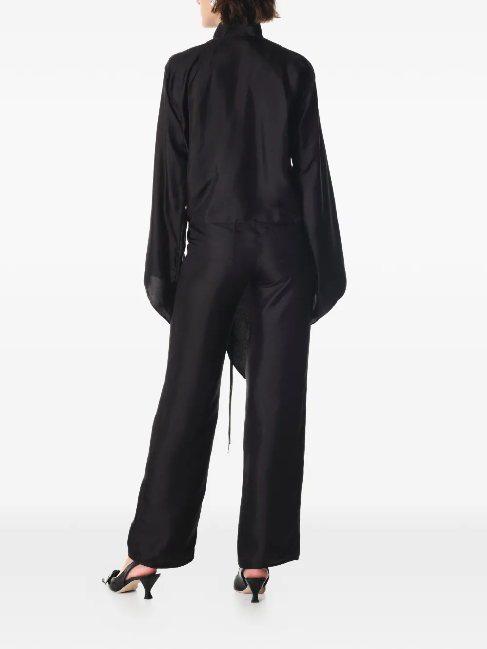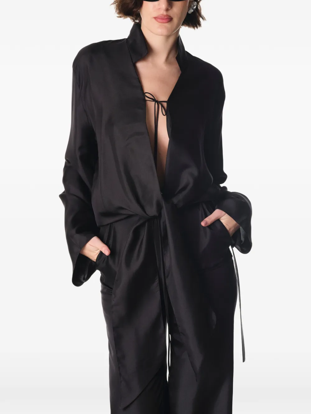 Черный шелковый топ с длинными рукавами, воротником и самозавязывающимися завязками
