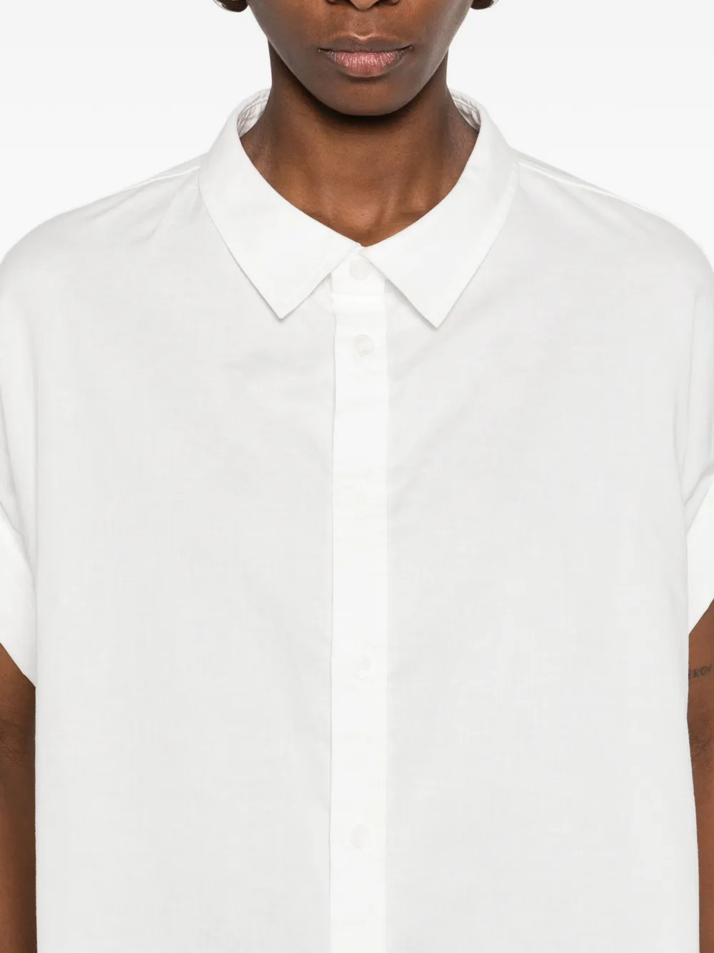Белый цвет, рукава с манжетами, застежка на пуговицы, классический воротник, укороченный крой