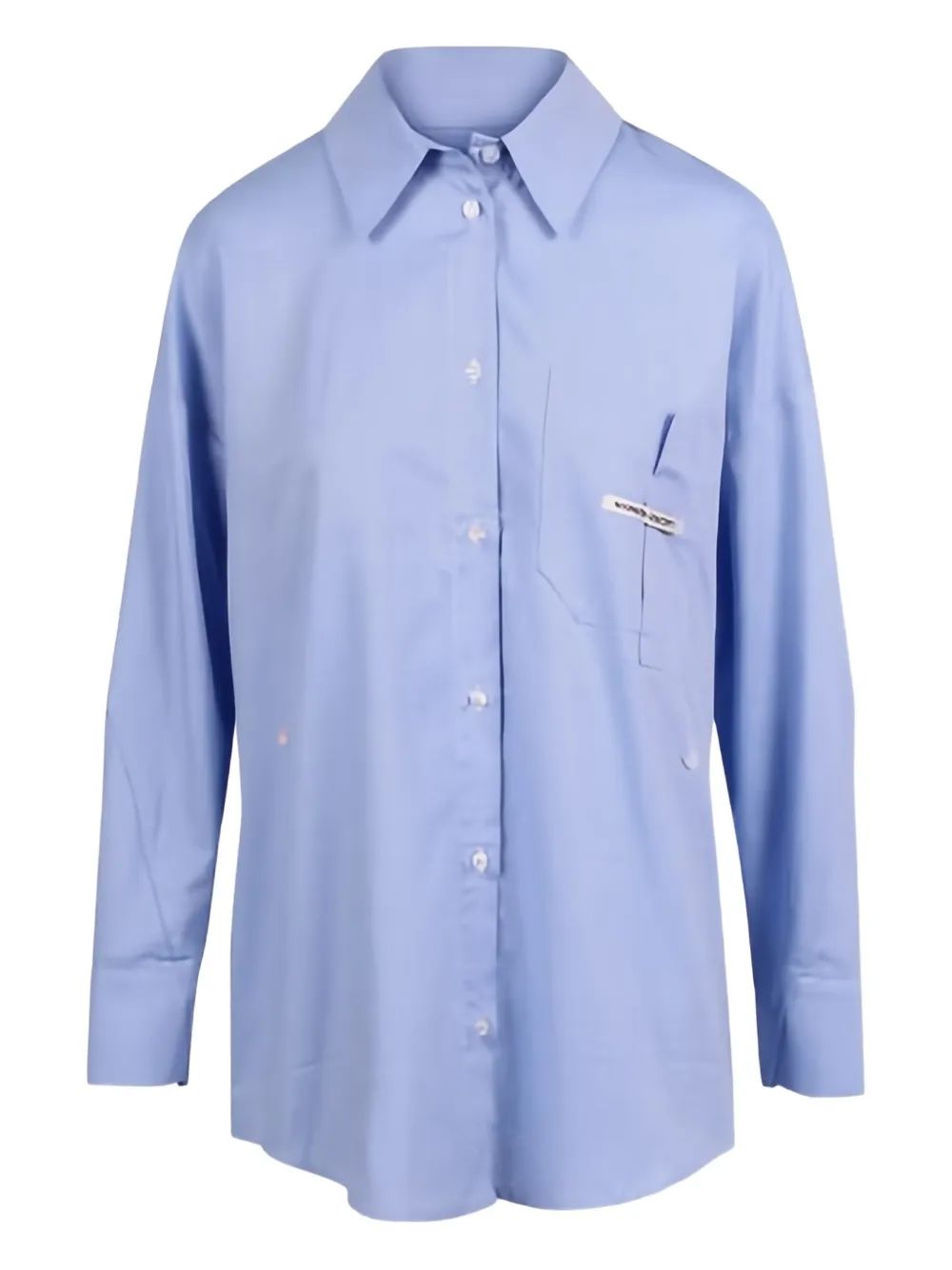 Светло-голубая рубашка с нагрудным карманом, застежкой на пуговицы, длинными рукавами, манжетами на пуговицах и надписью
