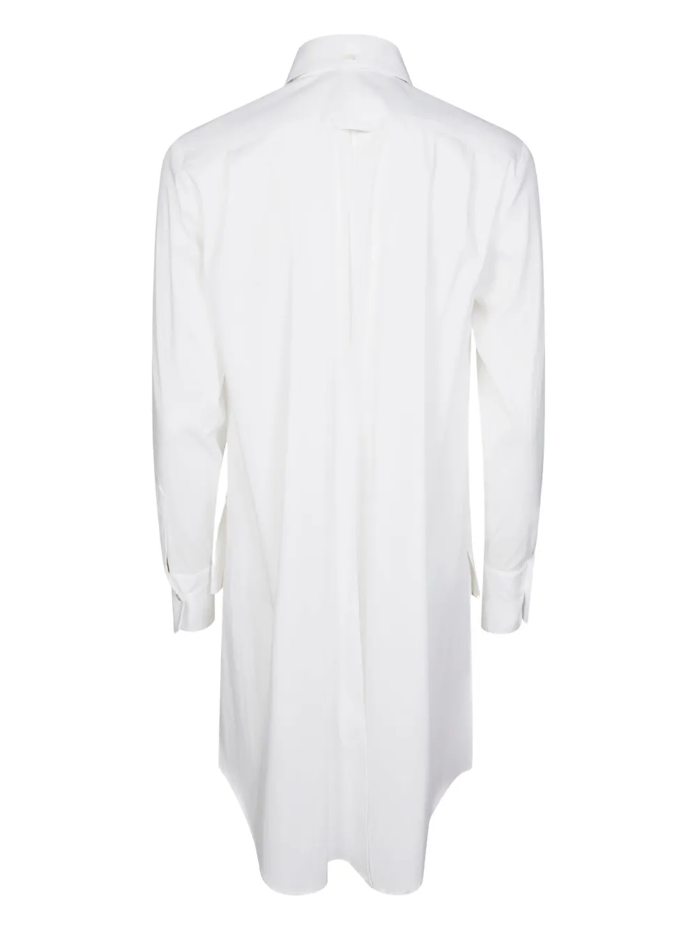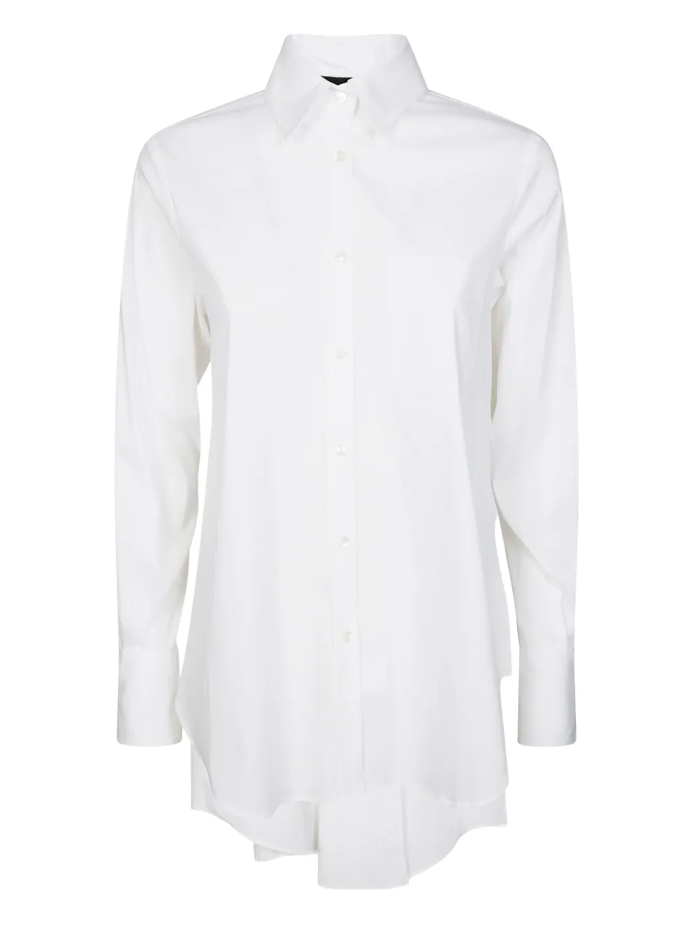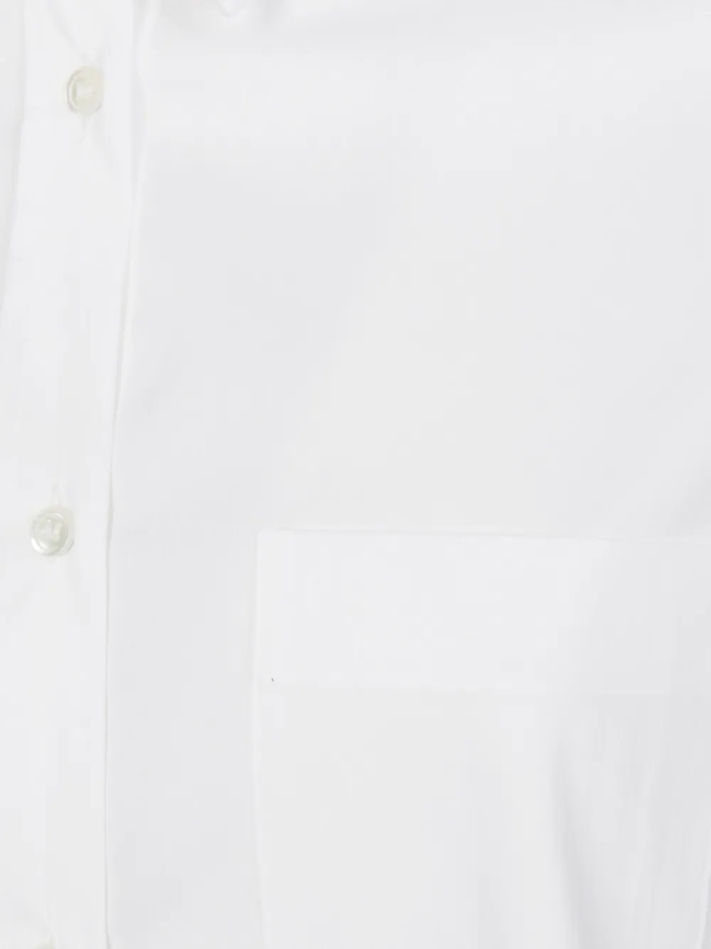 Белая рубашка с нагрудным карманом, застежкой на пуговицы, длинными рукавами, боковыми разрезами и манжетами на пуговицах