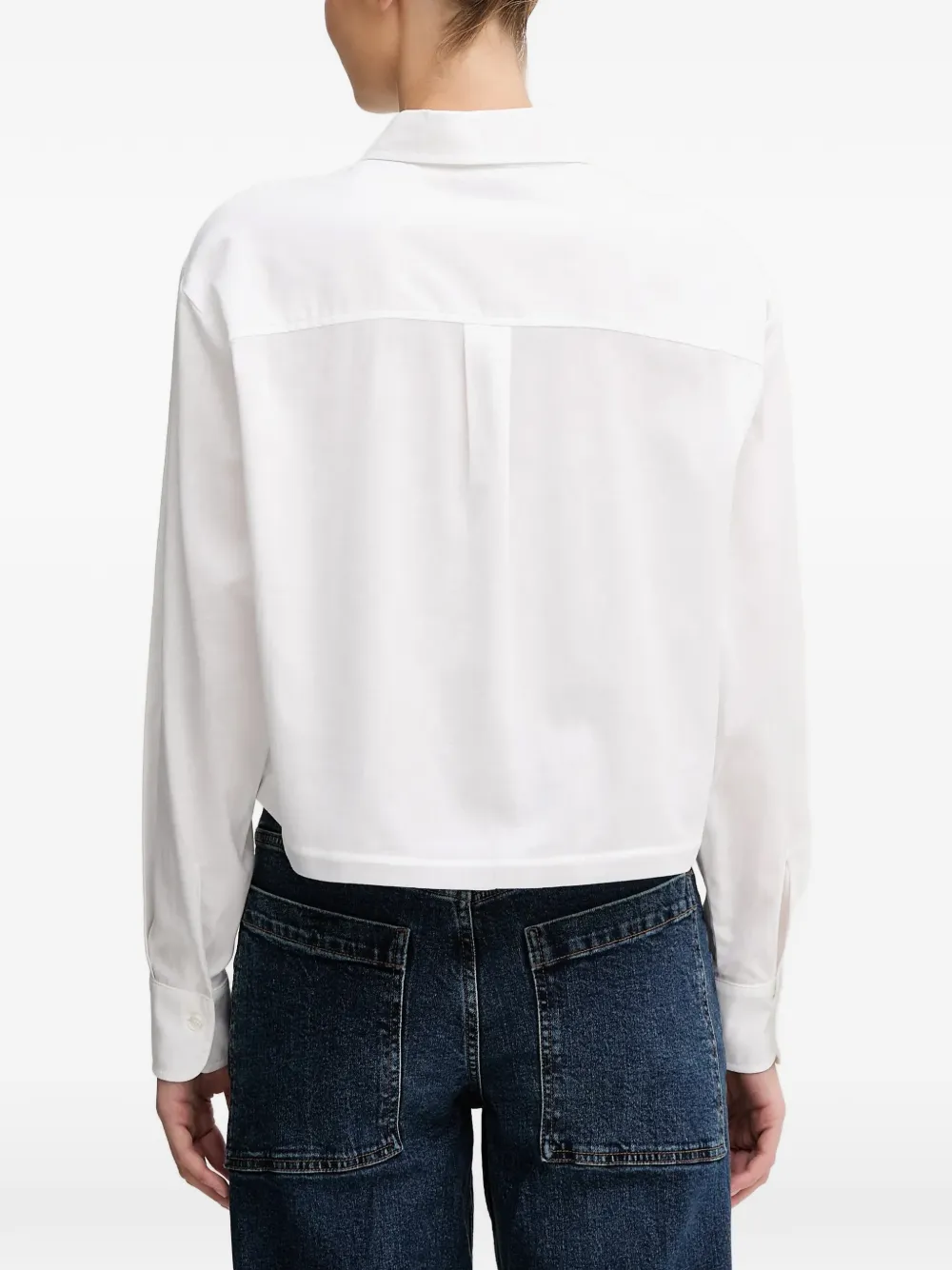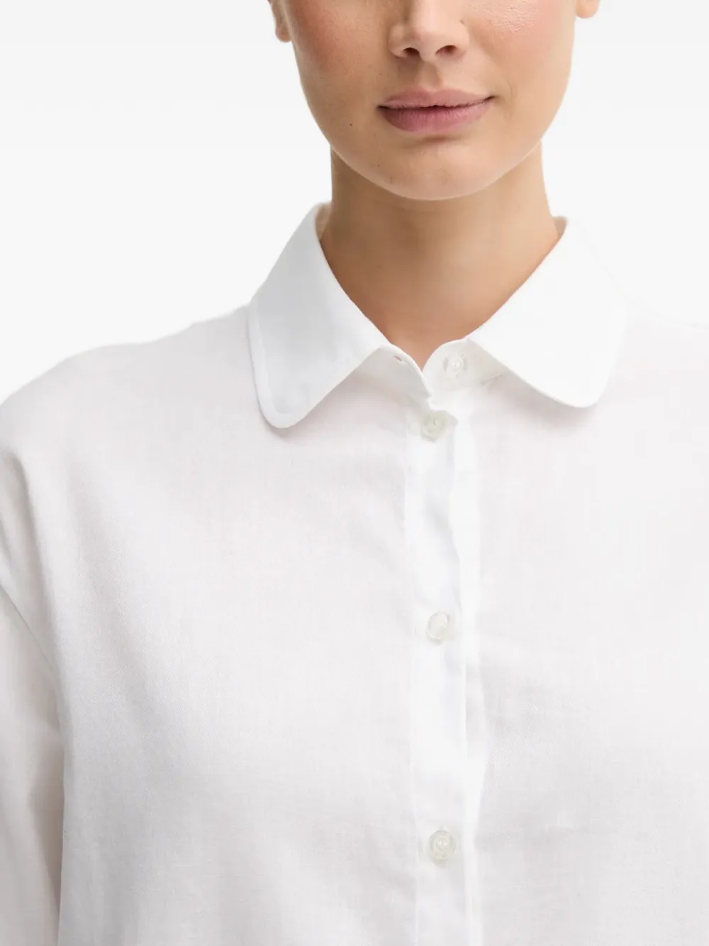 Белый воротник с острыми уголками, застежка на пуговицы, длинные рукава, детали с завязками