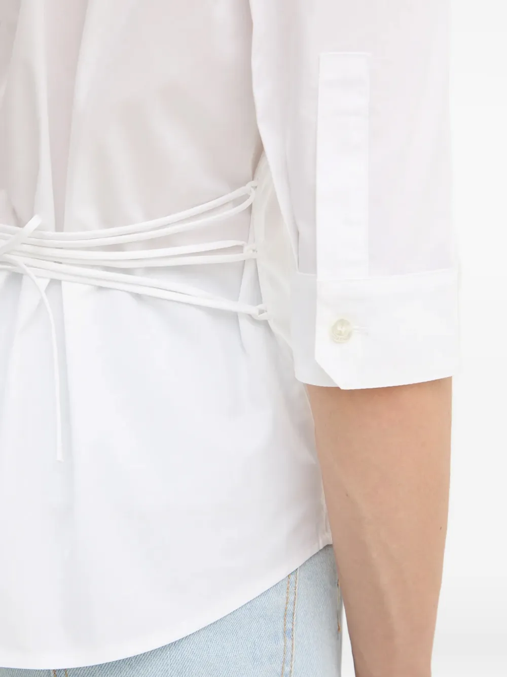 Белый с остроконечным воротником, нагрудным карманом, рукавами три четверти и завязкой