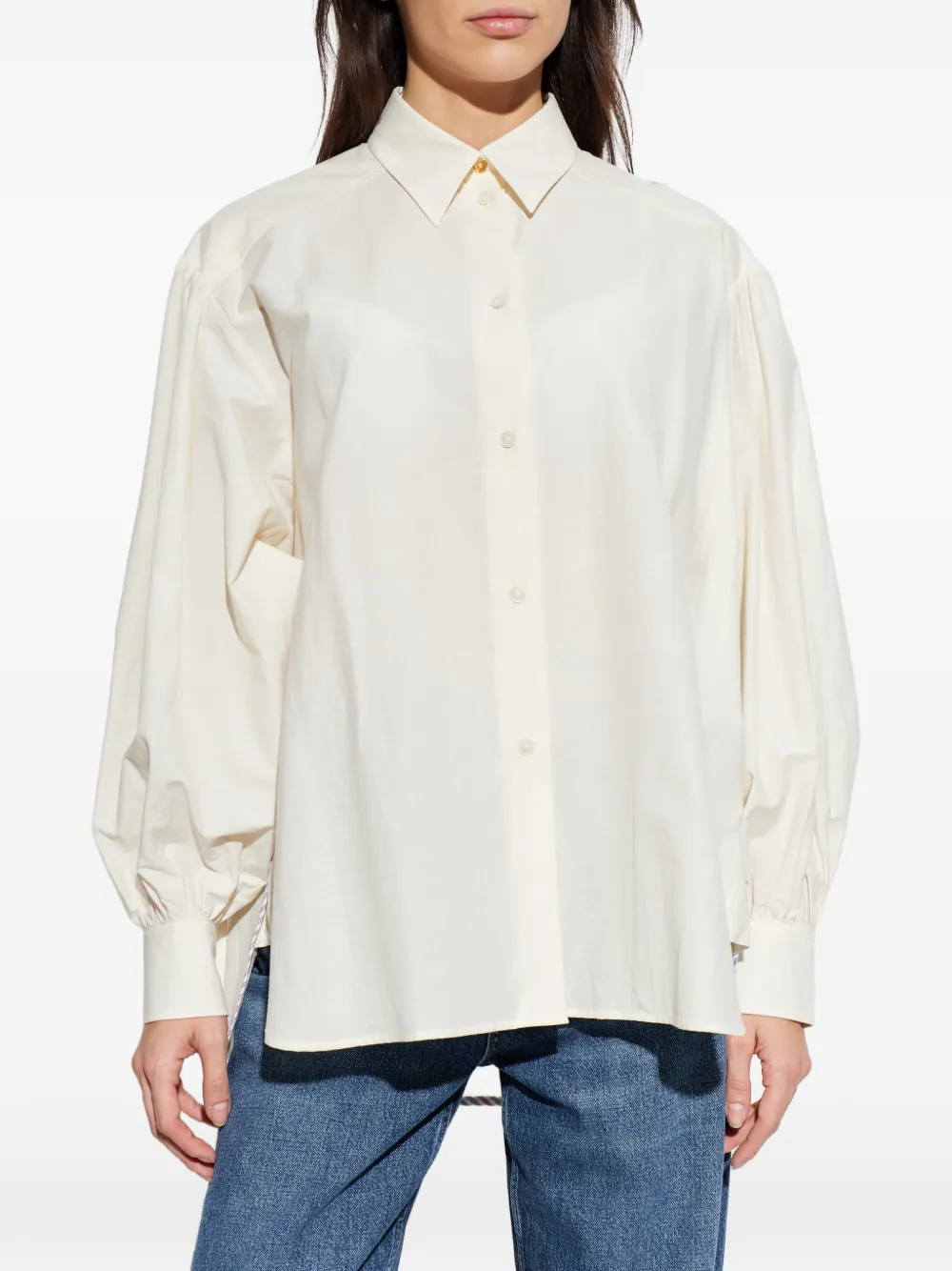 Кремовая (или бежевого цвета) рубашка с застежкой на пуговицы, воротником поло, рукавами-буфами, манжетами на пуговицах и кокеткой сзади