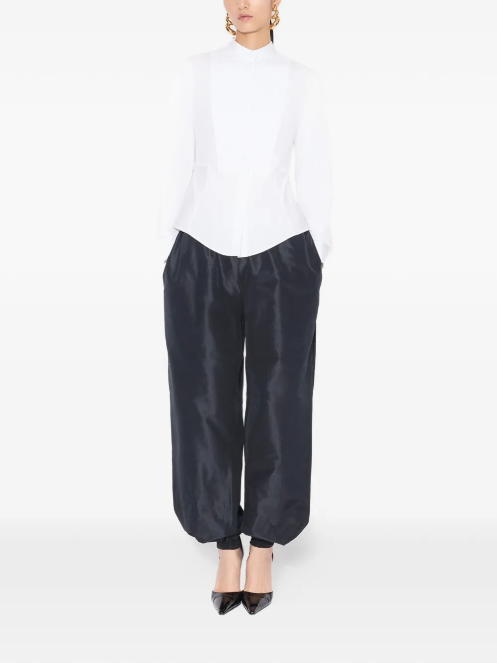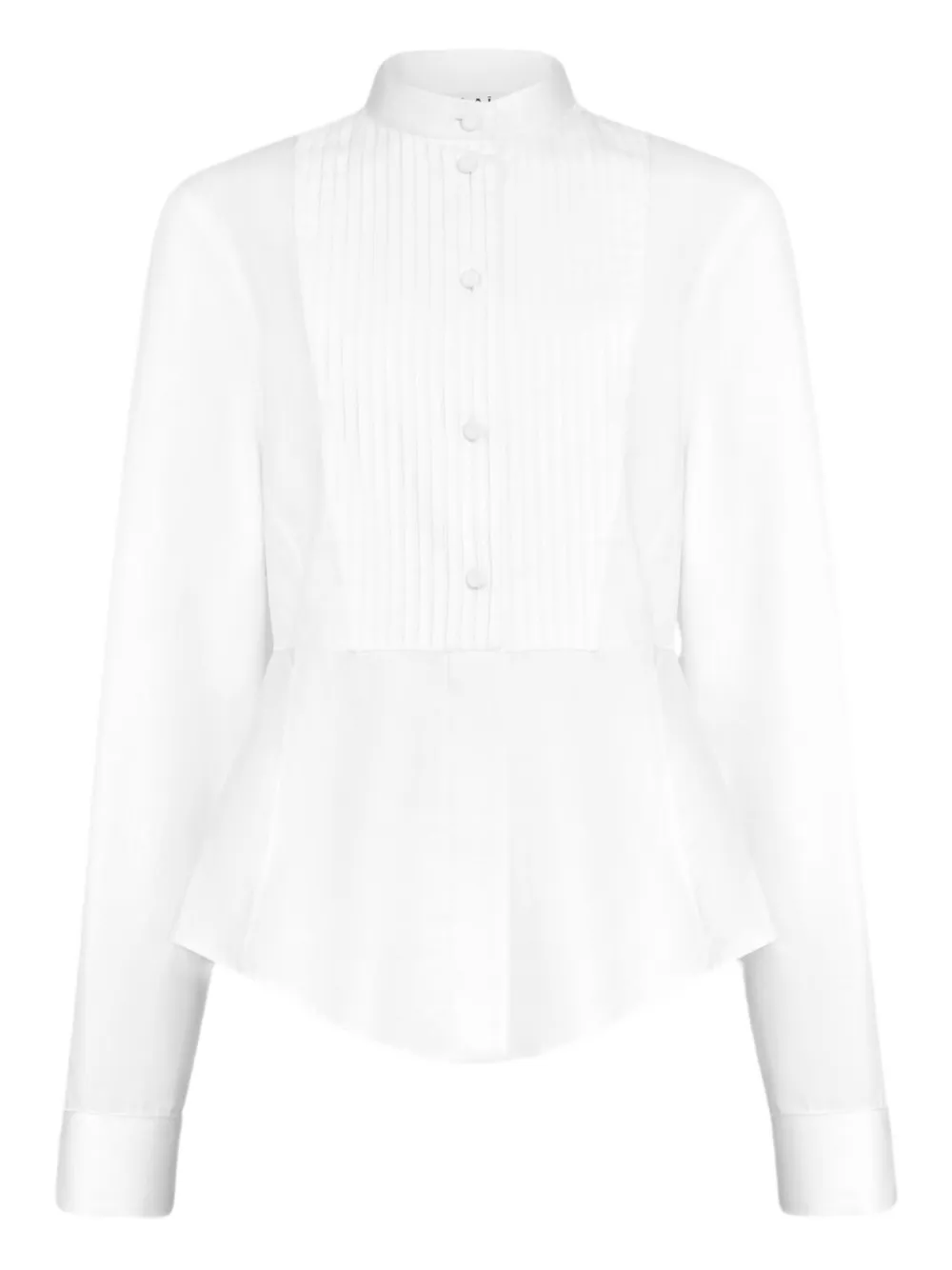 Белая блузка с плиссированной передней частью, застежкой на пуговицы, высоким воротником-стойкой, длинными рукавами и баской