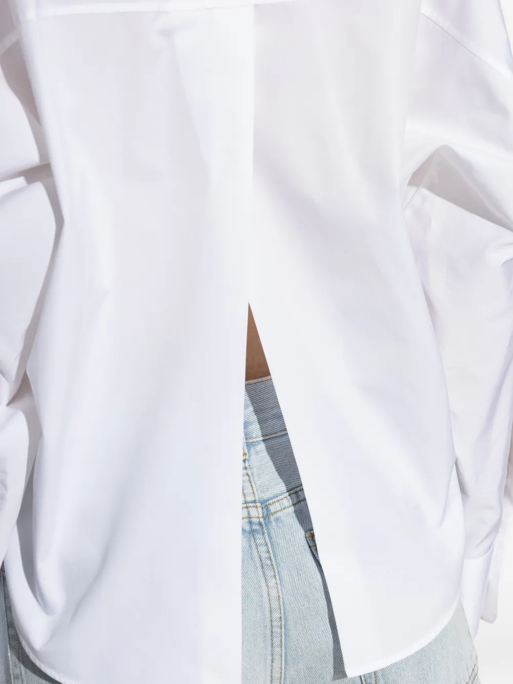 Белый цвет, застежка на пуговицы, стойка-воротник, длинные рукава, манжеты на пуговицах, шлица сзади