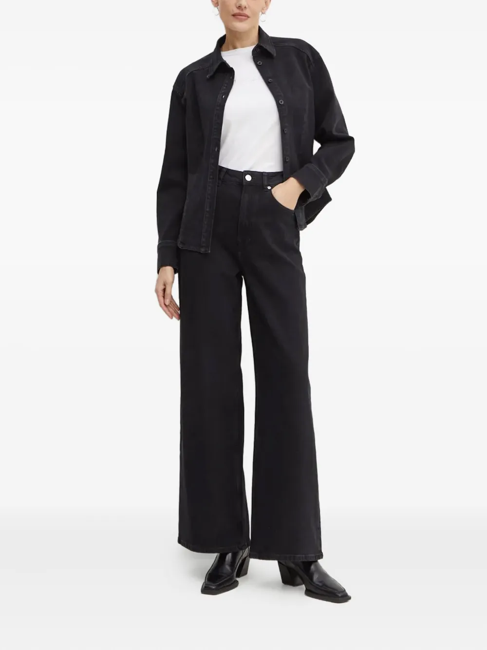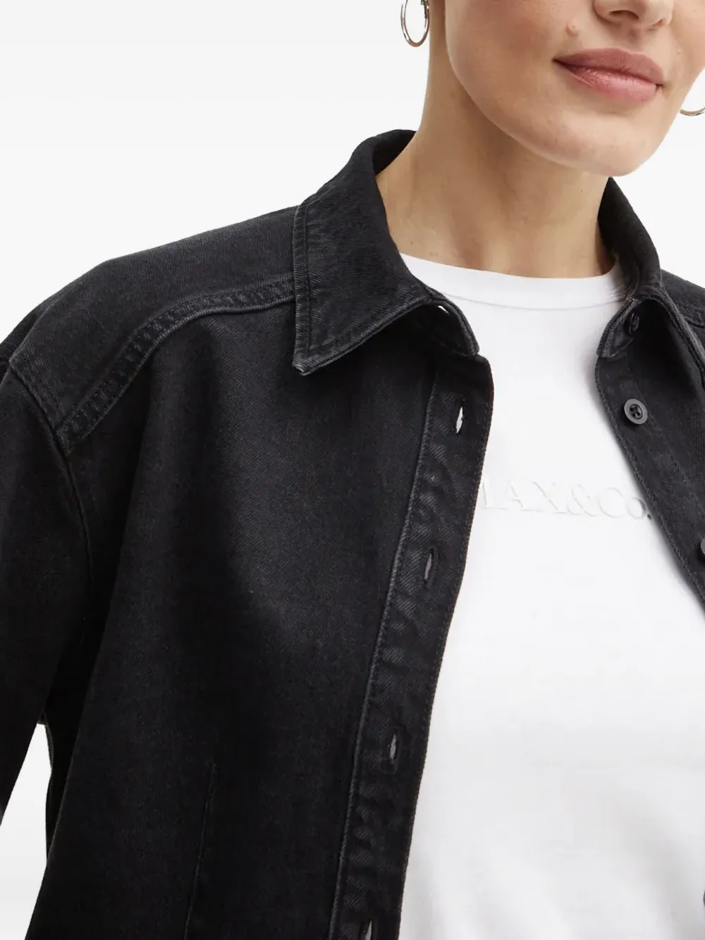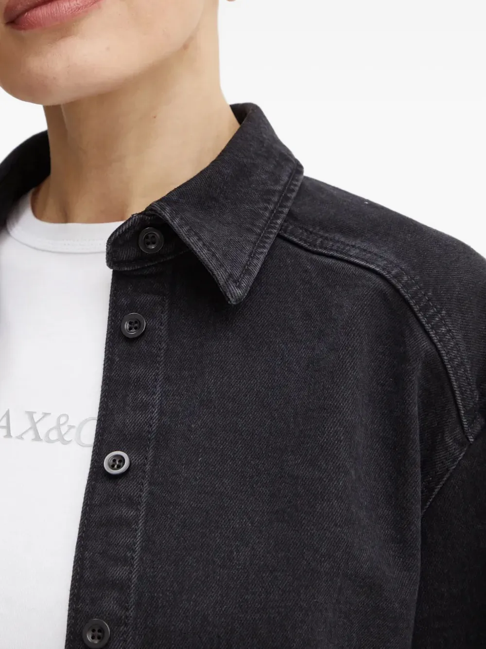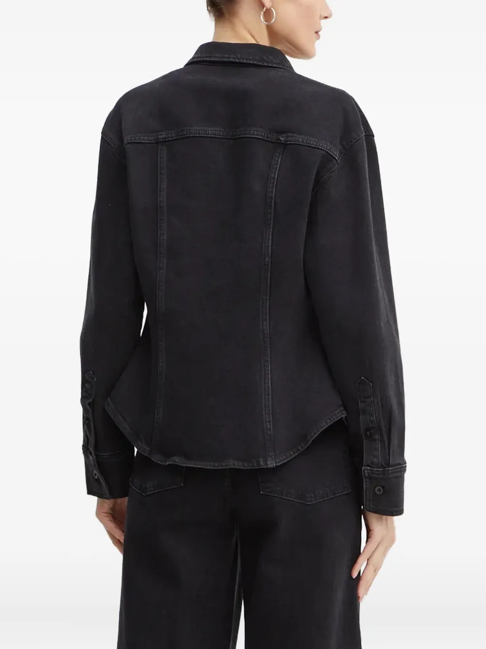 Черный цвет, воротник-стойка, застежка на пуговицы, длинные рукава, закругленный подол, свободный крой