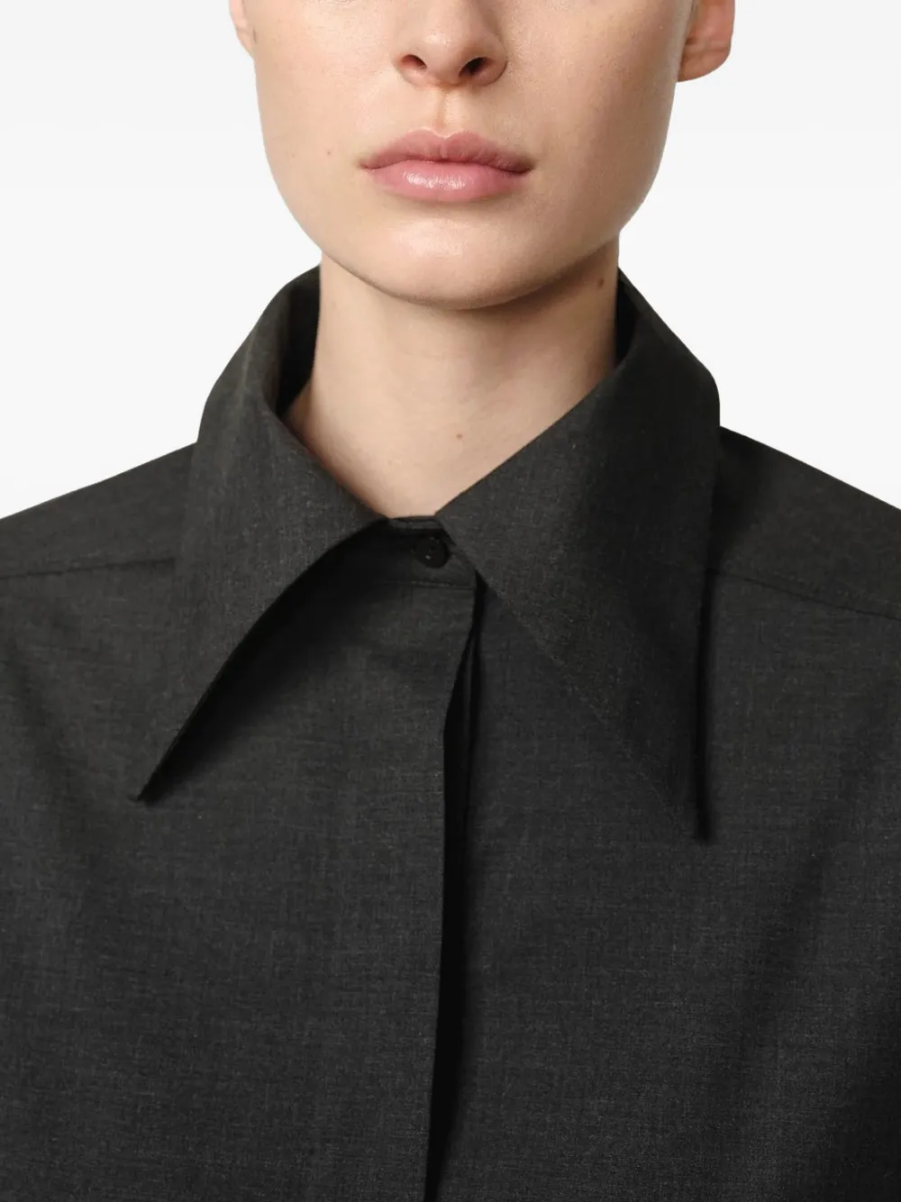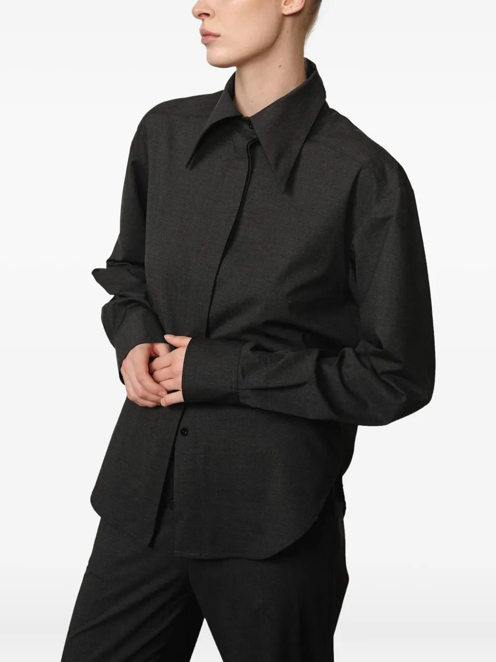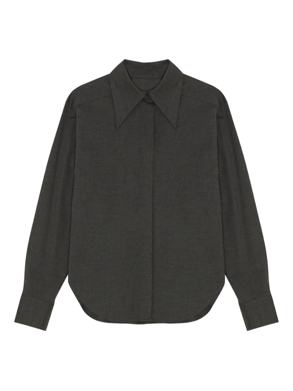 Темно-серый широкий воротник, застежка на пуговицы, длинные рукава, изогнутый подол