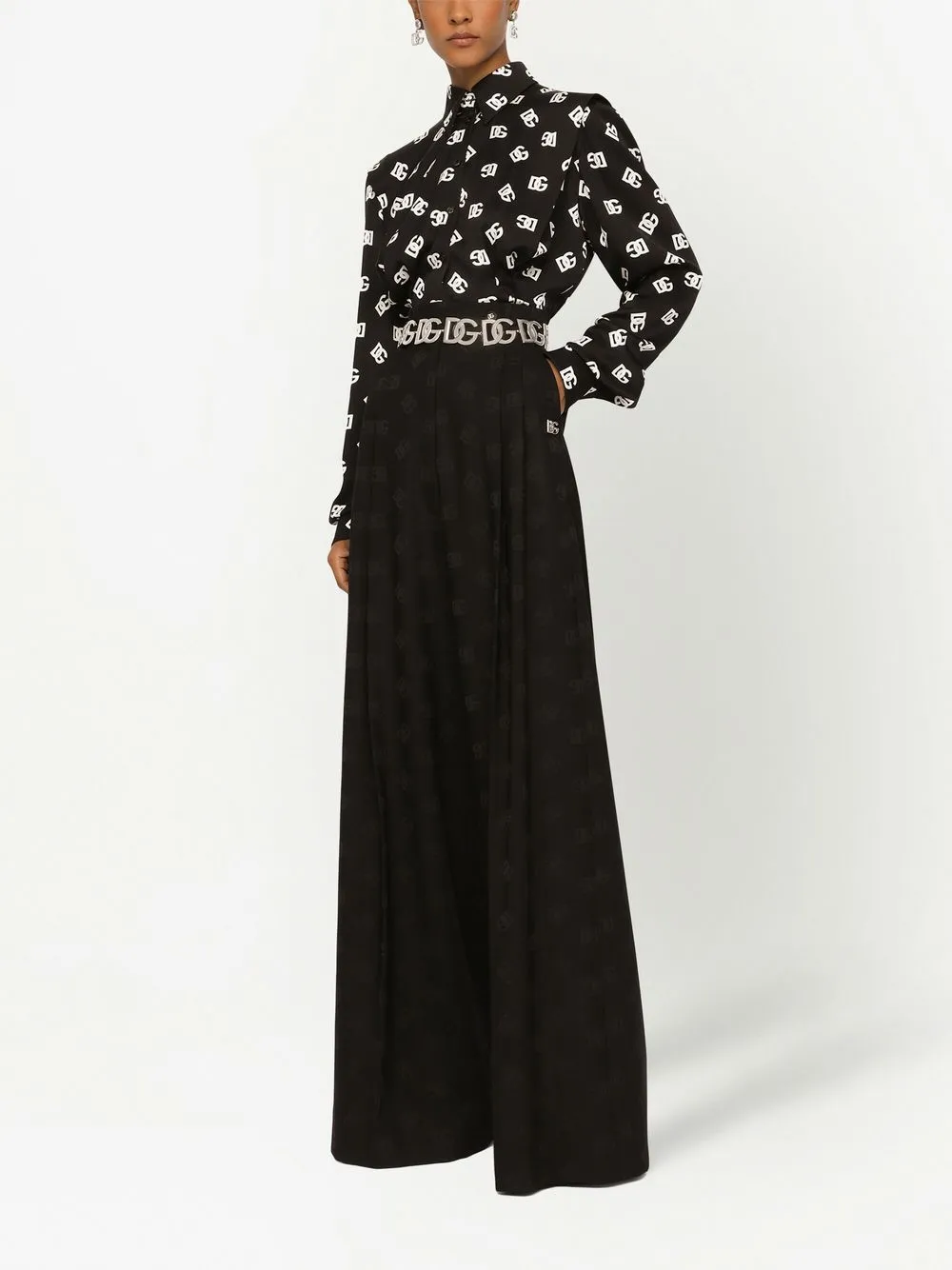 • Черный/белый, эластичный шелк, сплошной принт с логотипом, классический воротник, застежка на пуговицах спереди, длинные рукава, манжеты на пуговицах, приталенный силуэт и закругленный подол.